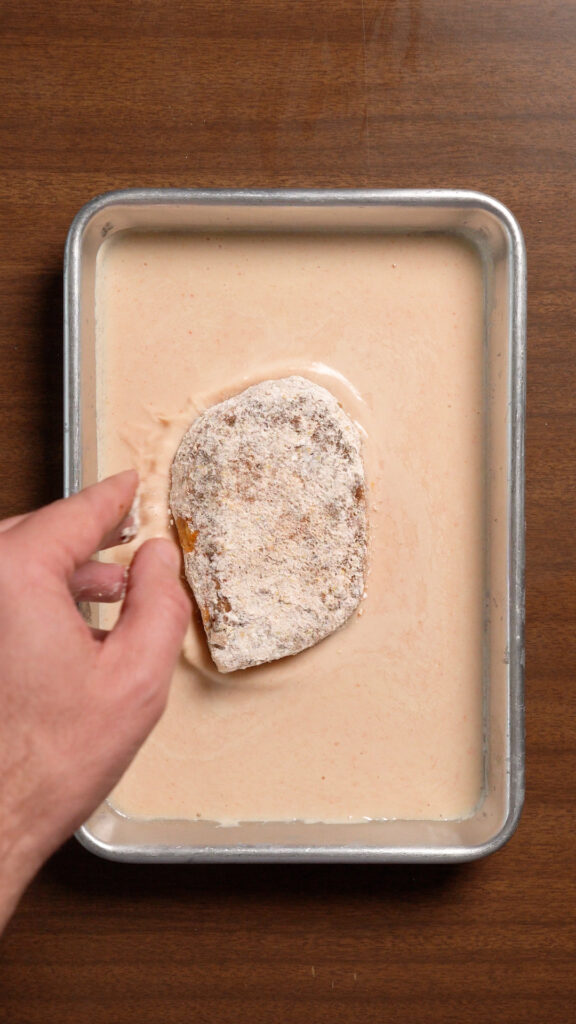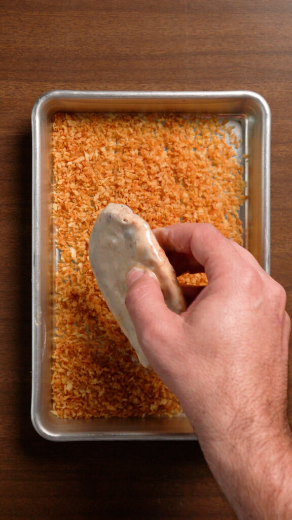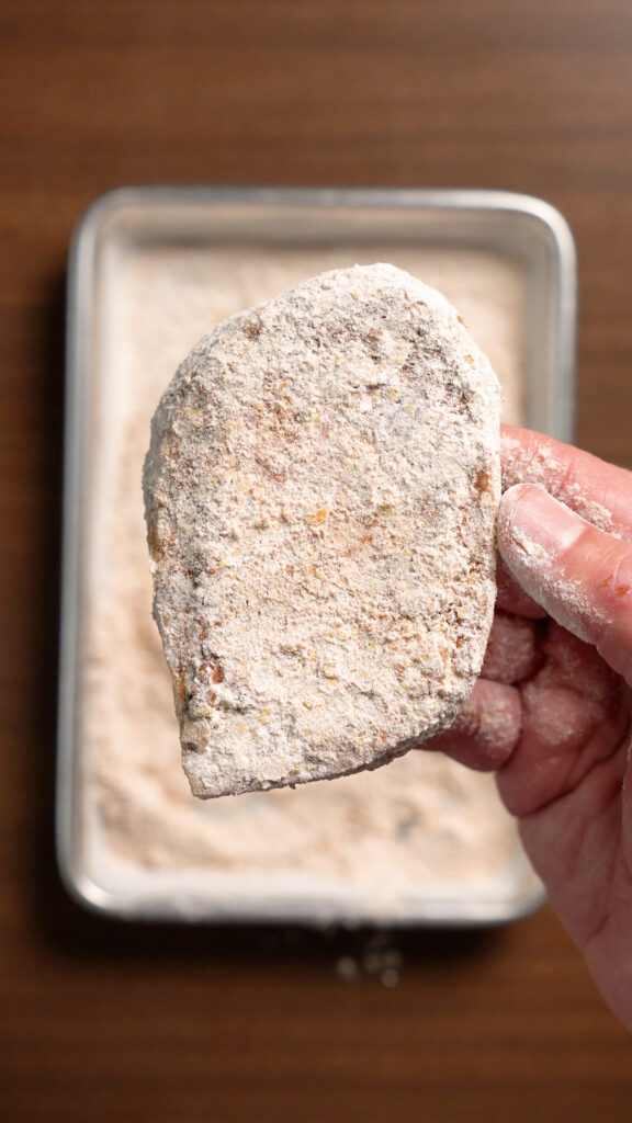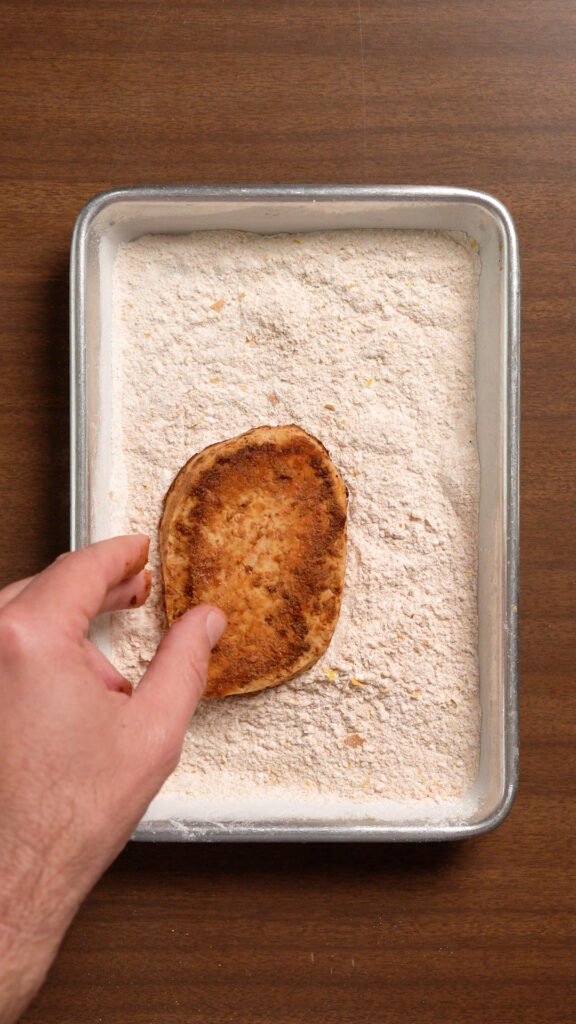 - Then dredge the filets in the seasoned flour, the vegan buttermilk, and finally the Panko or Cornflakes. Shake off the excess each time you dredge it and make sure you thoroughly coat it. If you want to double dredge for a thicker breading, dredge in the dry, wet, panko, and then the wet and panko again. You may need to adjust and increase the wet mixture if you go this route!