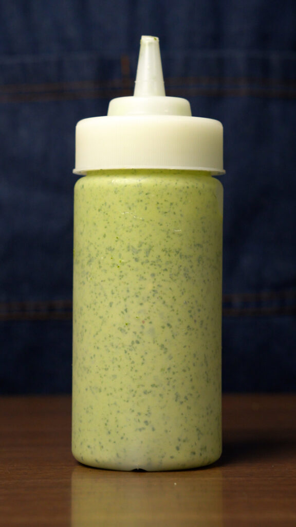 Then, simply blend all the ingredients together in a food processor or with an immersion blender. Store in a squeeze bottle if possible!