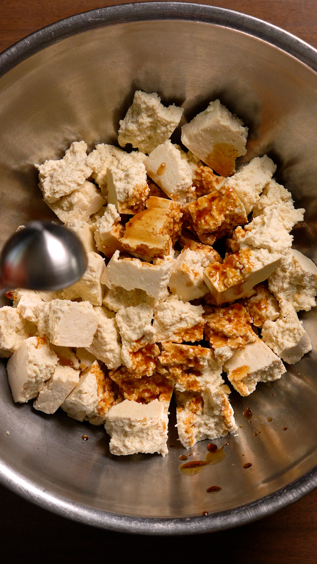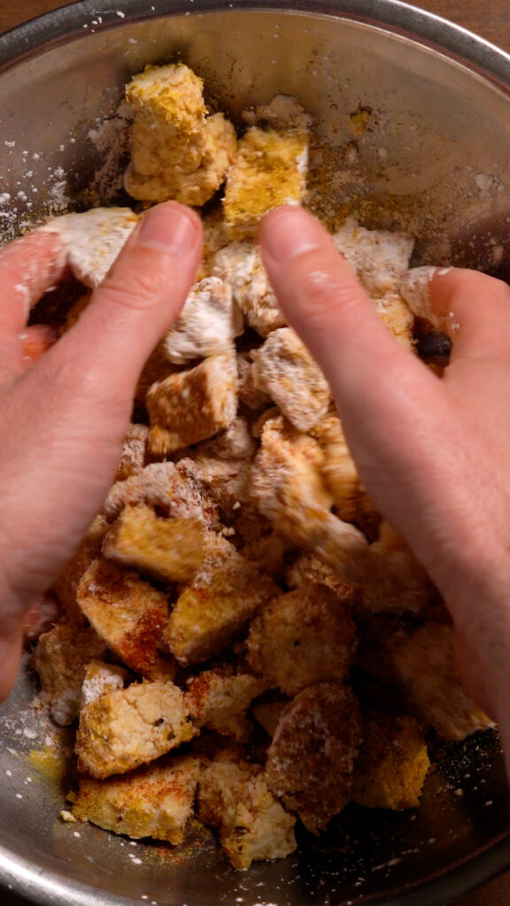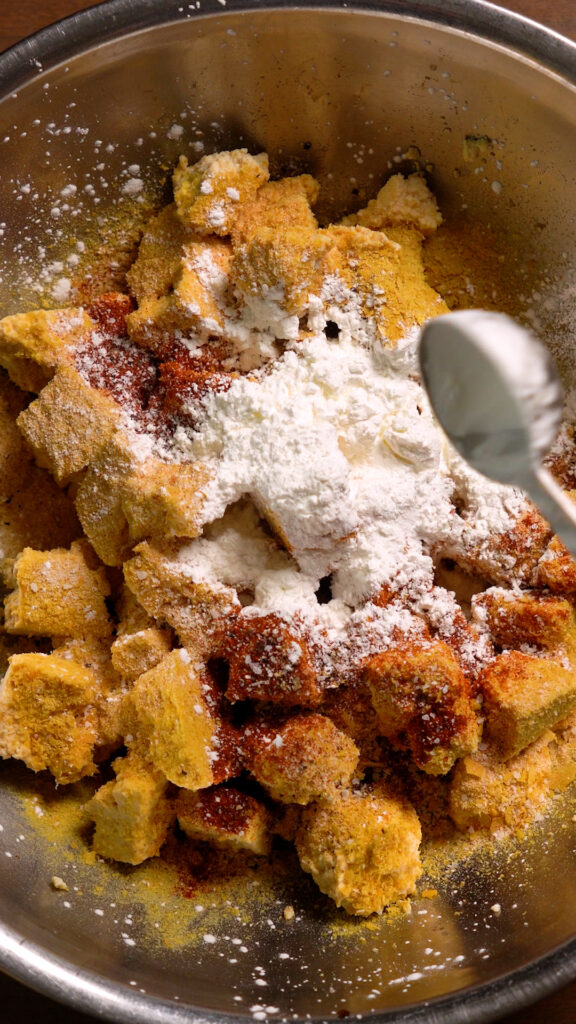 - Then toss the tofu chunks in the soy sauce. After that toss them in the seasonings and cornstarch.