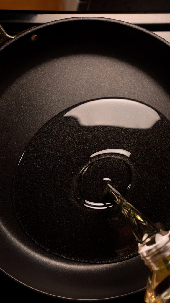 This couldn’t be easier! First add a layer of oil to a 12″ skillet. Use a neutral flavored high smoke point oil (Vegetable, Canola, Avocado etc). Heat the oil to 375 F.