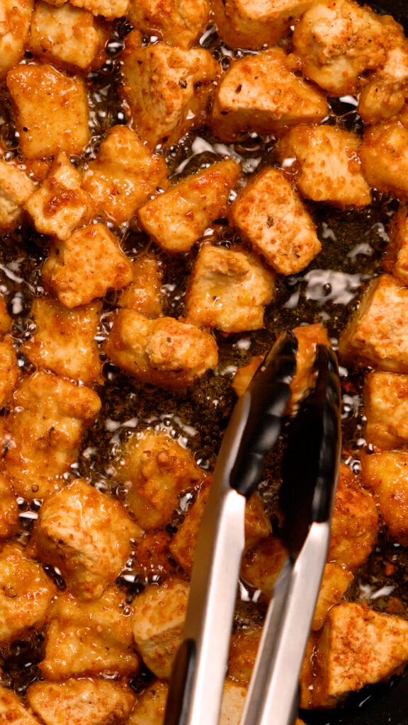 Then toss the tofu chunks in the soy sauce. After that toss them in the seasonings. Once oil is heated to 375 F, add the tofu chunks and fry for 3 – 5 minutes. Then flip and fry for another 3 – 5 minutes or until golden brown.