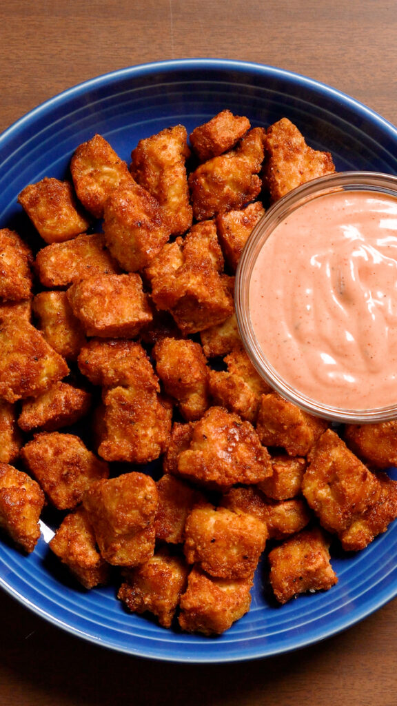 So yummy. So easy. Super firm tofu works great. Seasoning’s are good. So crispy when deep frying them in the oil. So good with Cane’s sauce. Cannot wait to make again. Thank you.