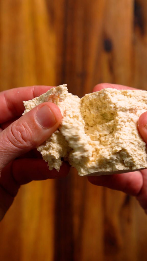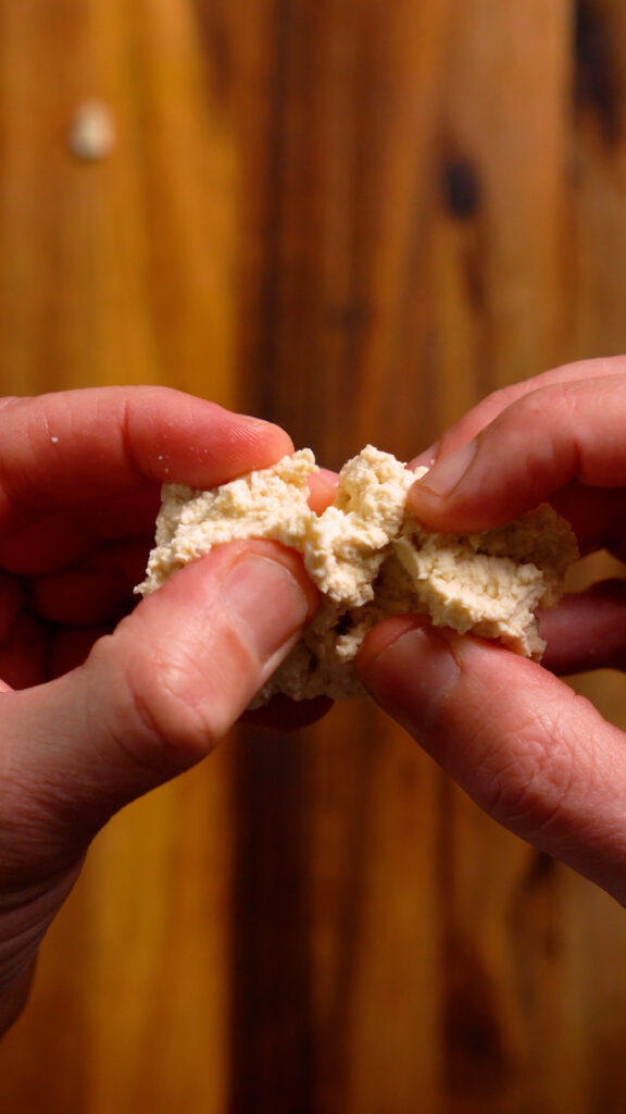While the oil heats up, break your tofu into bite size pieces. This will get you rougher edges than simply cutting the tofu into cubes. These craggier edges will crisp up more!