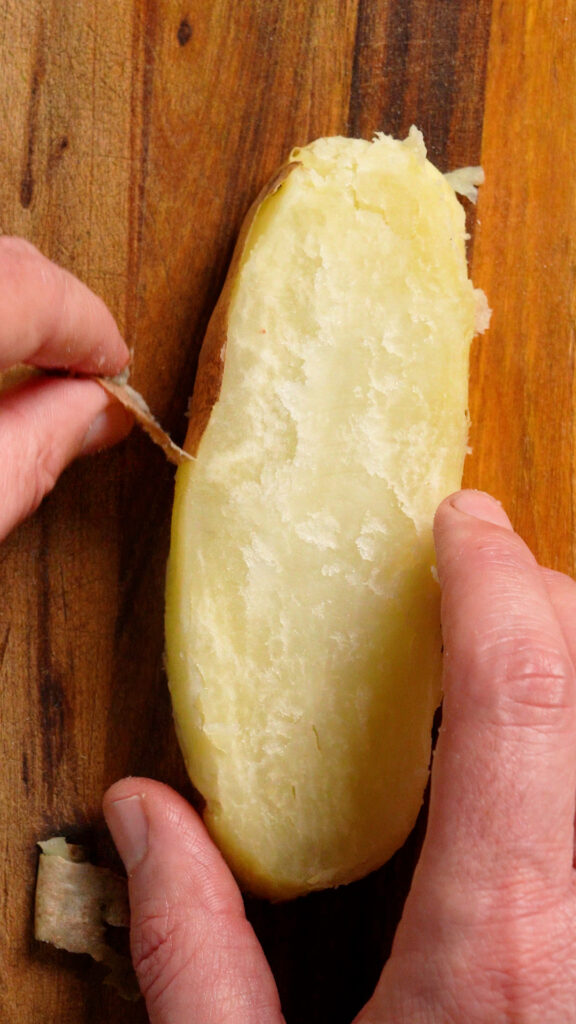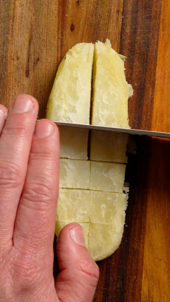 - Let them cool for a minute or so, then cut them into thirds long ways. You can keep the skin on, but they will be very easy to peel as well. Just make sure you don't burn yourself as they will still be hot. If you find them too hot to handle let them cool for a bit after cutting into thirds.Next cut each plank in half longways. Cut each sliver into cubes 3/4 to 1" thick.