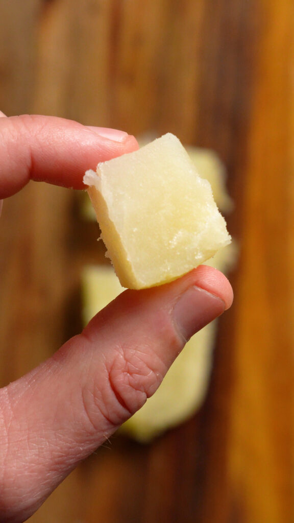 Next cut each plank in half longways. Cut each sliver into cubes 3/4 to 1″ thick.