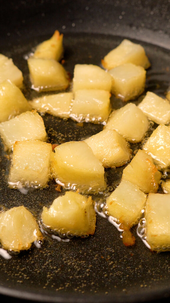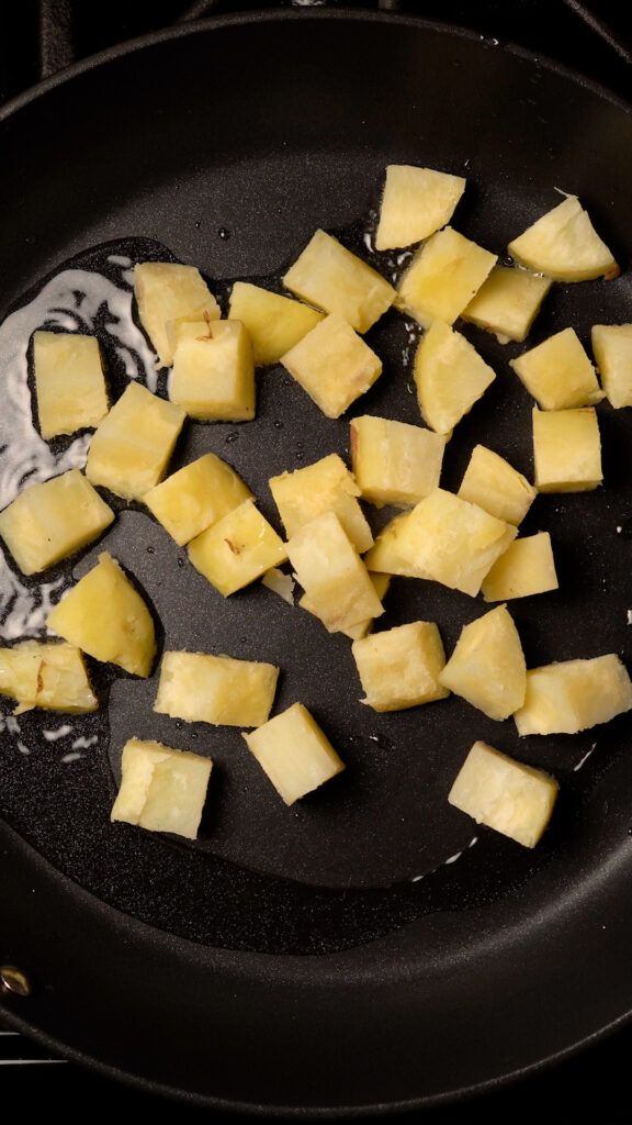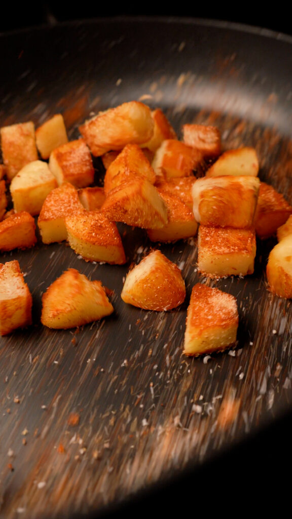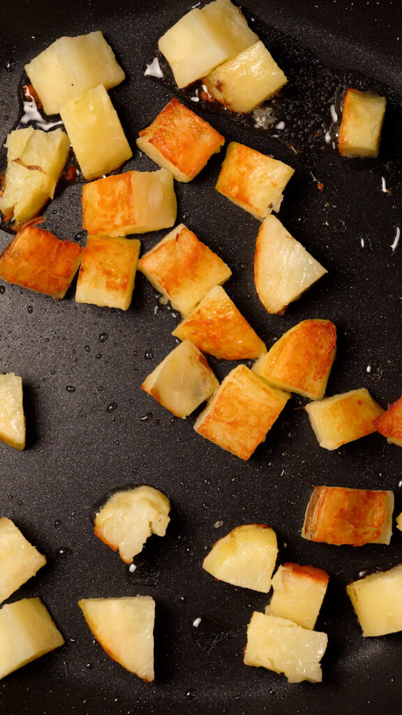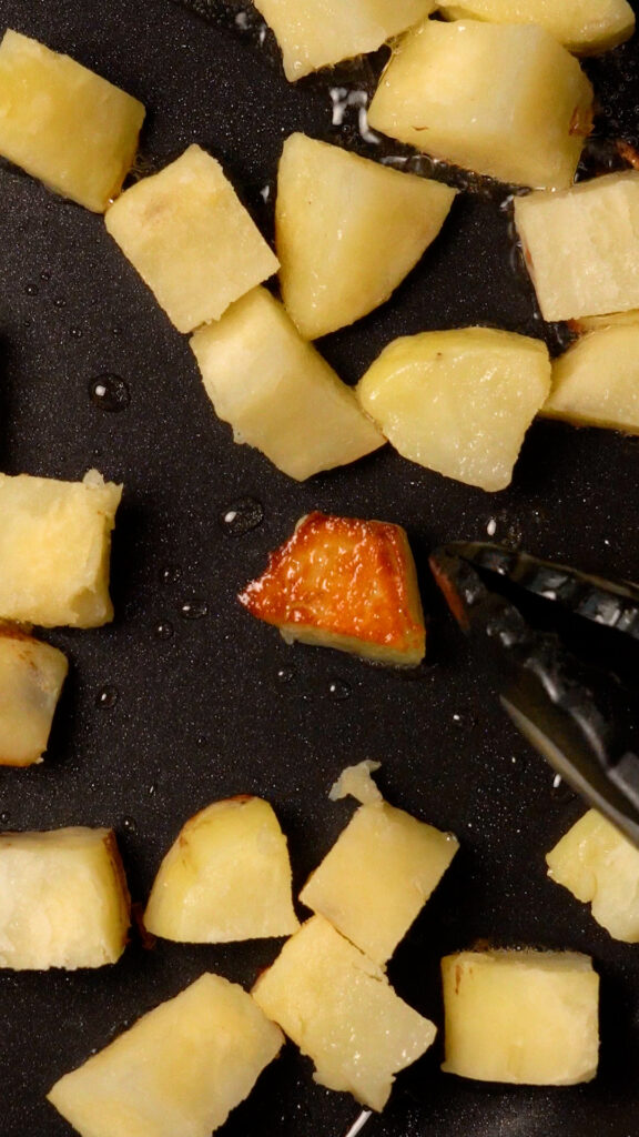 Heat up about 2 Tbsp of oil in a 12″ skillet (non-stick or cast iron will work) for about 3 minutes over medium heat. Add the potatoes making sure not to crowd the pan. You may need to fry in batches.