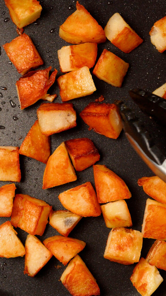- Alternatively, if you want to quickly brown all sides of the potatoes, add enough oil to the pan to come up about half way to the potatoes. Cook for 5 minutes, then flip, and cook for another 3 – 5 minutes, All the sides will be browned much quicker!