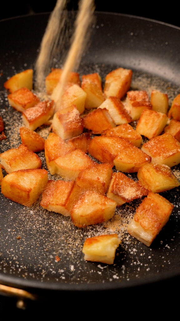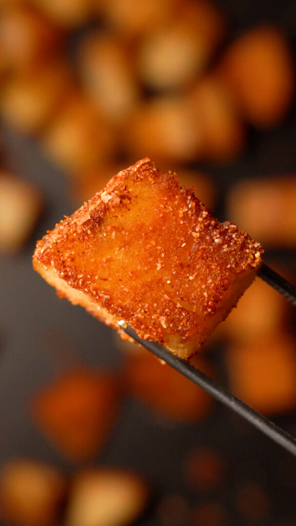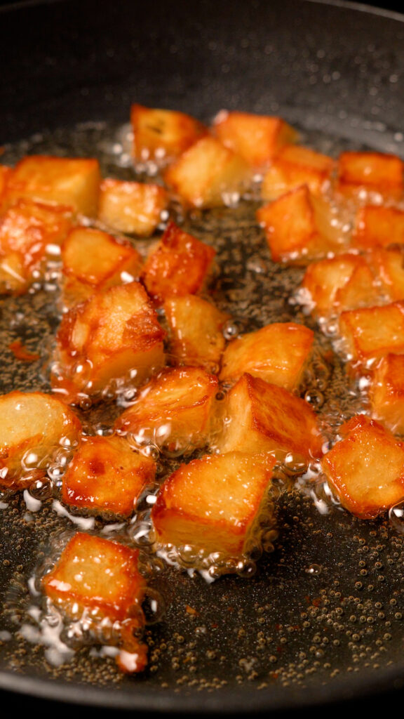 Alternatively, if you want to quickly brown all sides of the potatoes, add enough oil to the pan to come up about halfway to the potatoes. Cook for 5 minutes, then flip, and cook for another 3 – 5 minutes, All the sides will be browned much quicker!