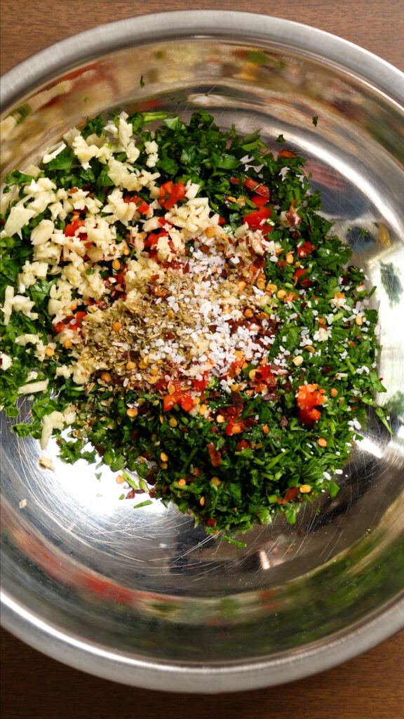 There are a lot of ways to make a Chimichurri, and I don’t claim this as being totally authentic! It’s just the way I like to make it, but we’ll be using some Italian parsley, garlic, olive oil, red pepper flakes (and a red pepper) and dried oregano.