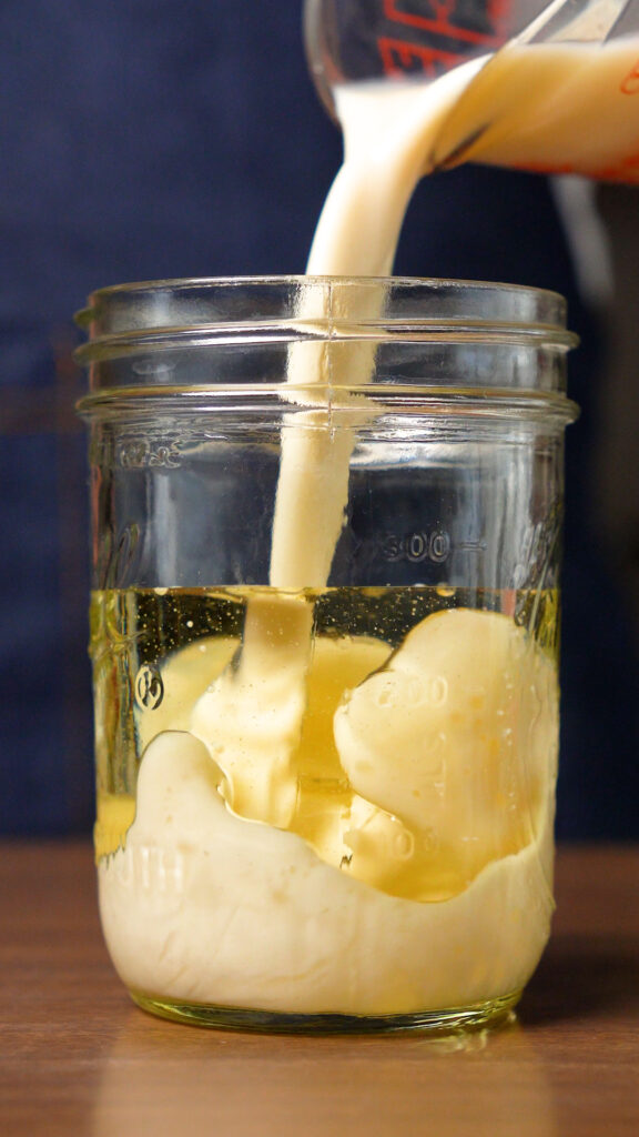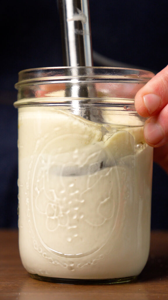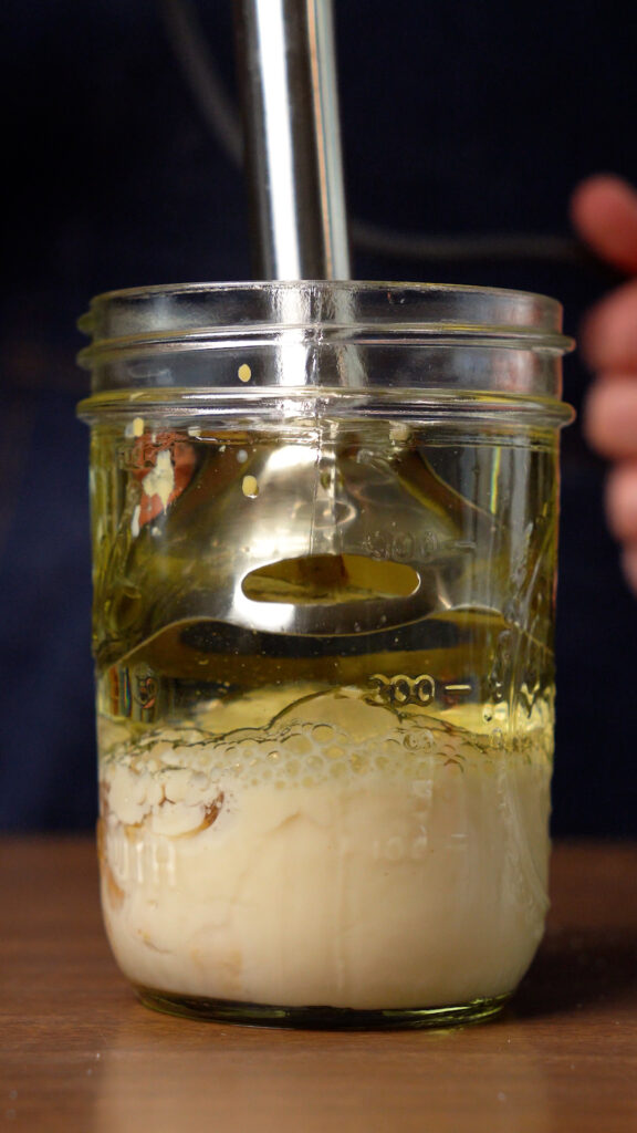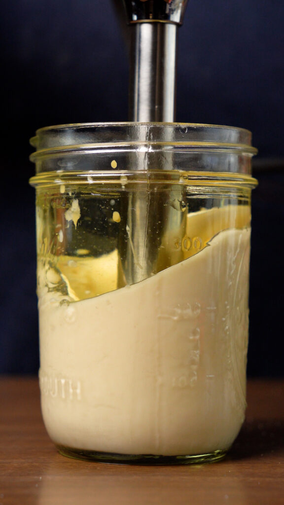 This is quite simple! You just need to add everything to a mason jar, and then using an immersion blender, you’ll blend it until it’s emulsified. Start at the bottom, and slowly move your way up.