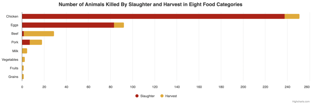 It’s basic math. An omnivore diet kills billions of farmed animals, plus the crop deaths for the feed for the farmed animals, plus the crop deaths from plants. Whereas a vegan diet is just crop deaths from the plants we eat.