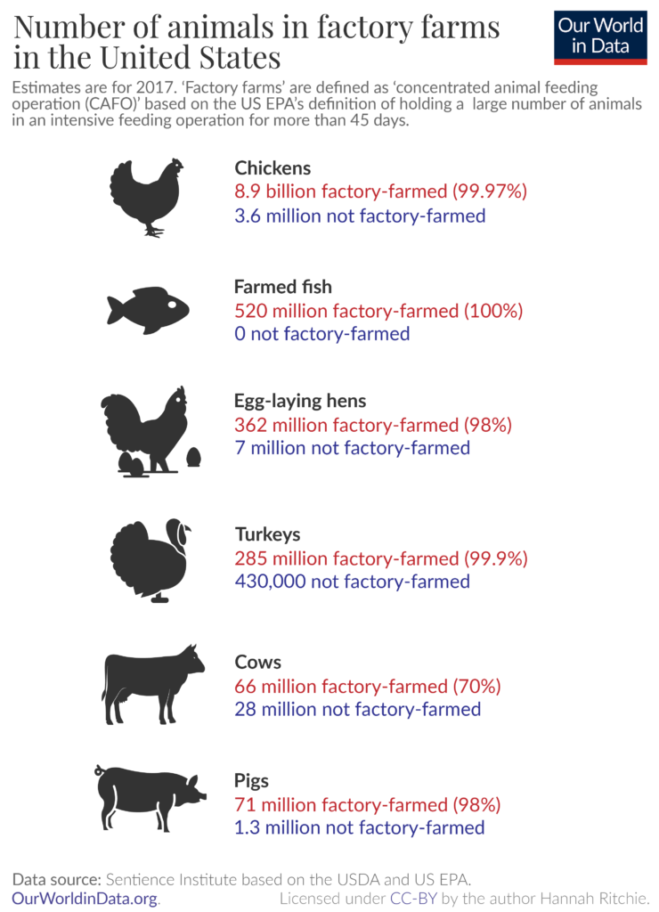 But nobody lives like that. And it’s also not sustainable at the current rate of consumption. That’s why the vast majority of slaughtered animals comes from Factory Farms.