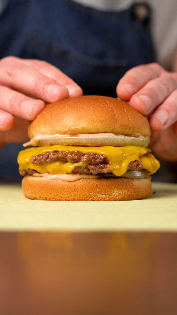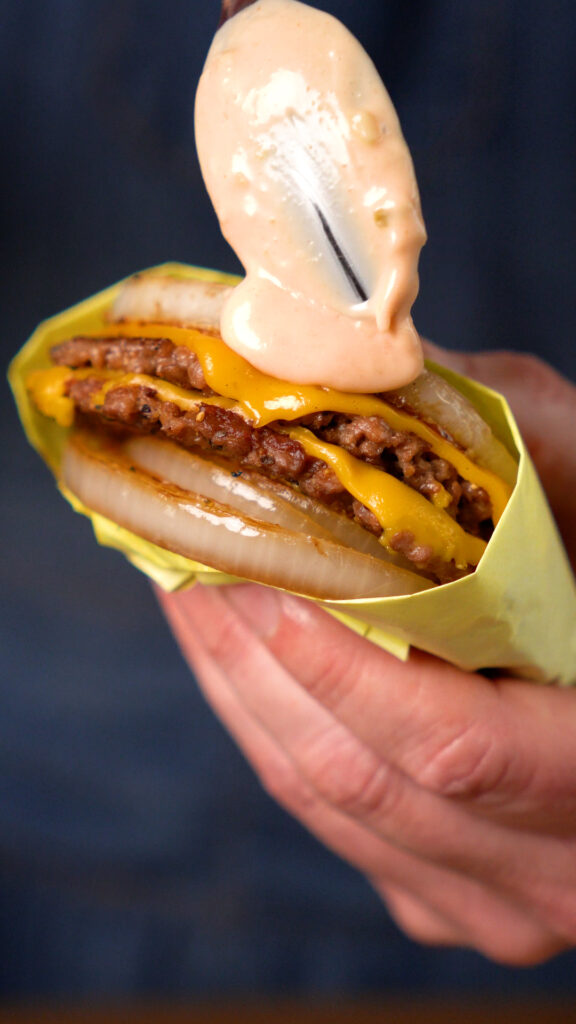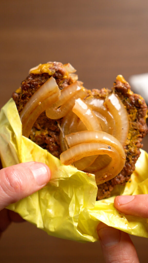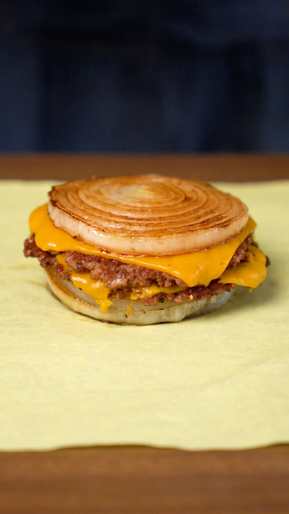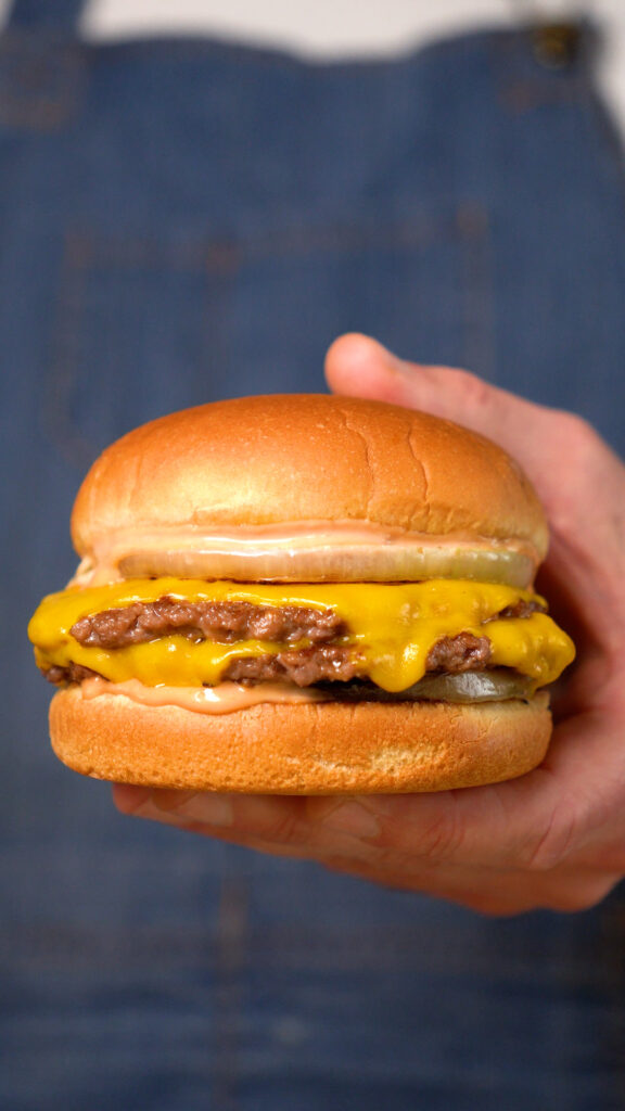 In order to nail an In-N-Out style burger, you want to make sure you use 2 oz patties. Otherwise the burger will be too tall and hard to eat. You can use something like Impossible or Beyond Meat, or whatever plant-based meat you like.