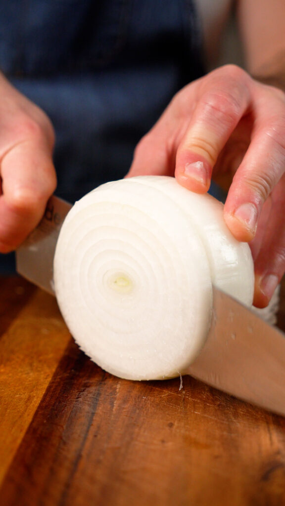 - Cut the onions into whole onion slices. Be gentle so the individual onion rings don't separate.