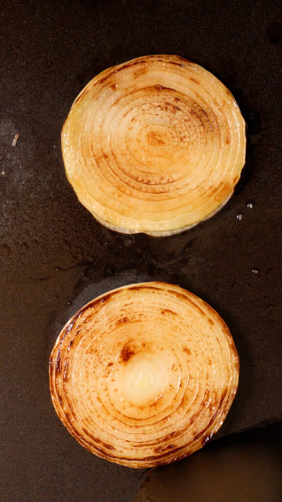 Slice some whole onions, handle them gently so they stay together and the individual rings don’t separate. Grill them in some oil, and flip as many times needed until they are nice and browned.