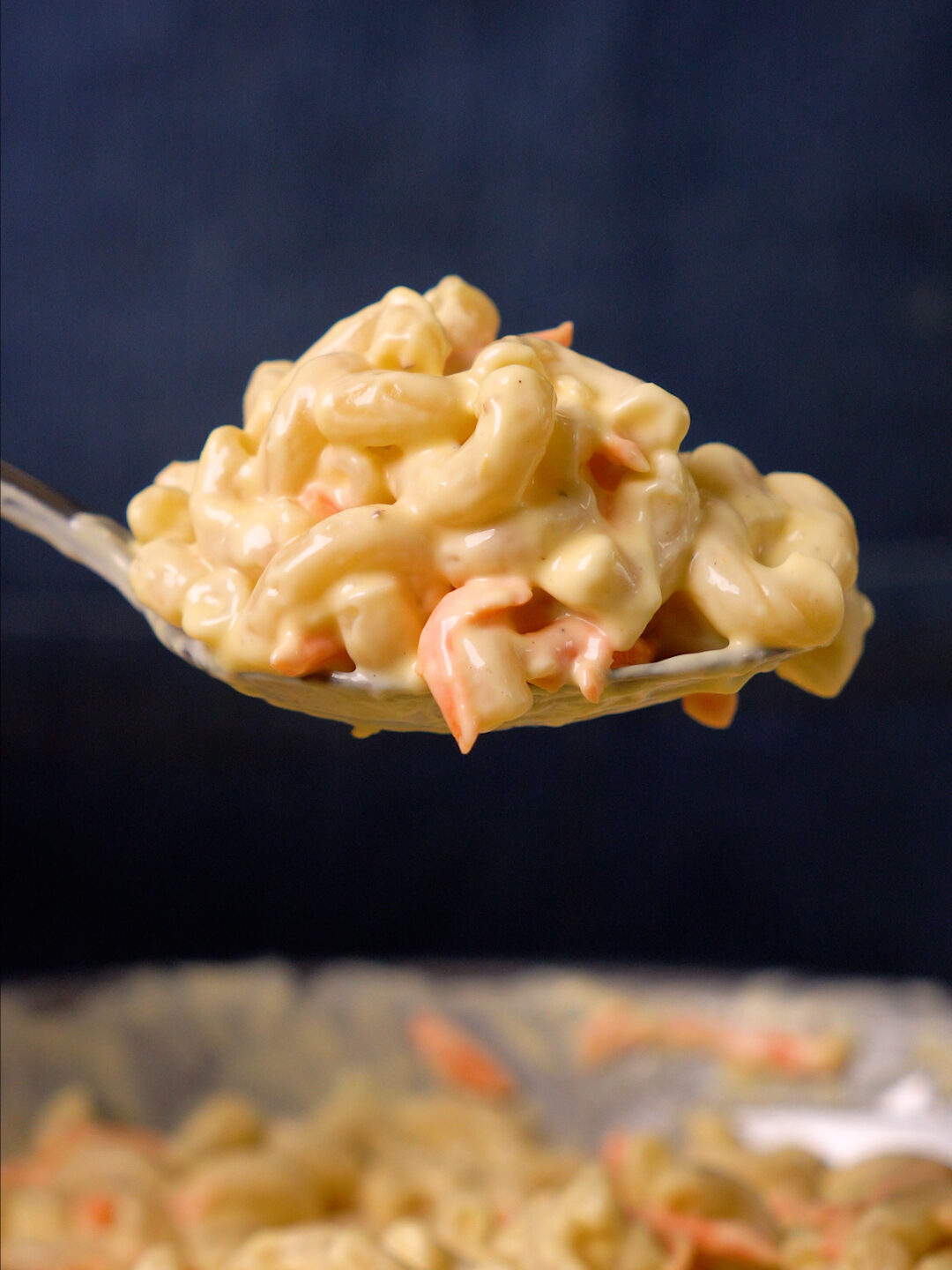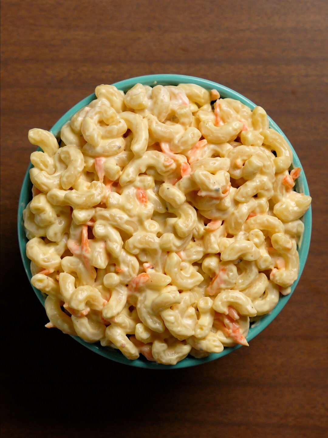 It relies less on adding fresh herbs and crunchy veggies than a Classic Macaroni Salad, and instead employs a good amount of Mayonnaise (typically Hellman’s / Best Foods), some shredded carrots (some recipes call for celery but I wasn’t a fan of the chunky texture) and then a few more seasonings. It’s a very simple recipe, but super dang delicious!
