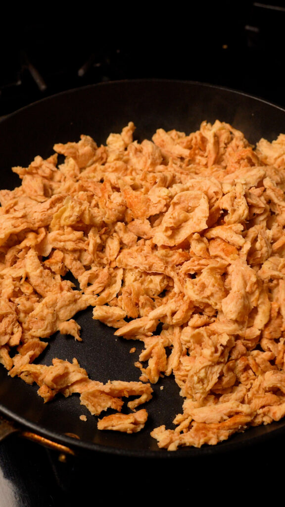 Another step you can take to dry out the Soy Curls, is to toast them in a dry frying pan for 5 – 10 minutes. You can always eat one to test out the texture, or if you see some browning, that is a good sign they are good to go.