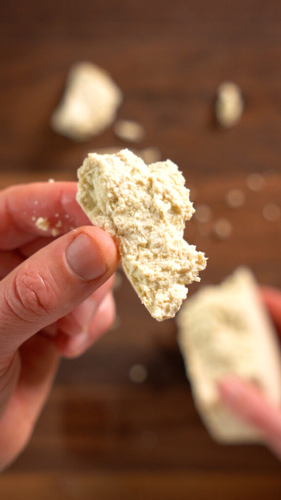 The process is quite simple! First we’ll slice our block of tofu into fillets. The next step is optional. However I find that replicating the shape of a chicken breast really sells the dish! The eyes eat first as they say!