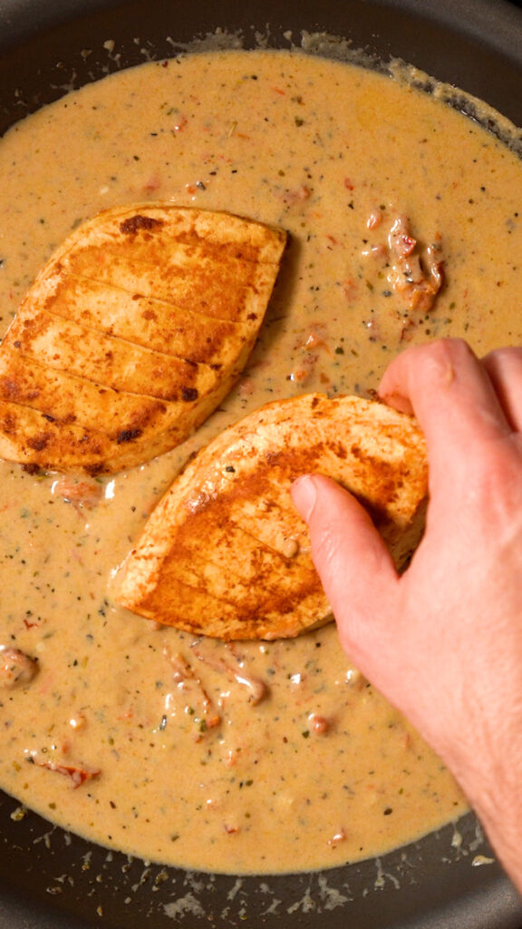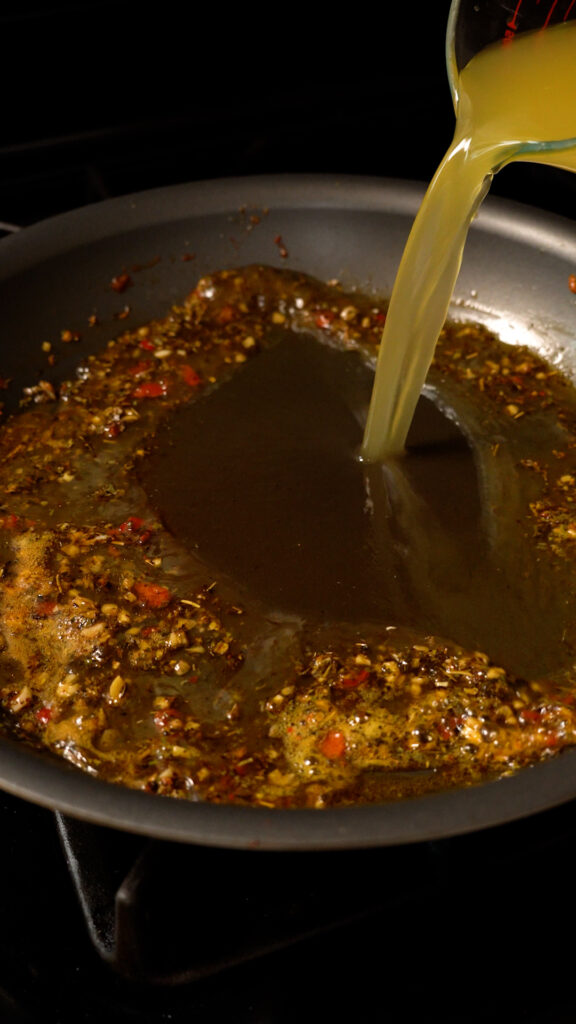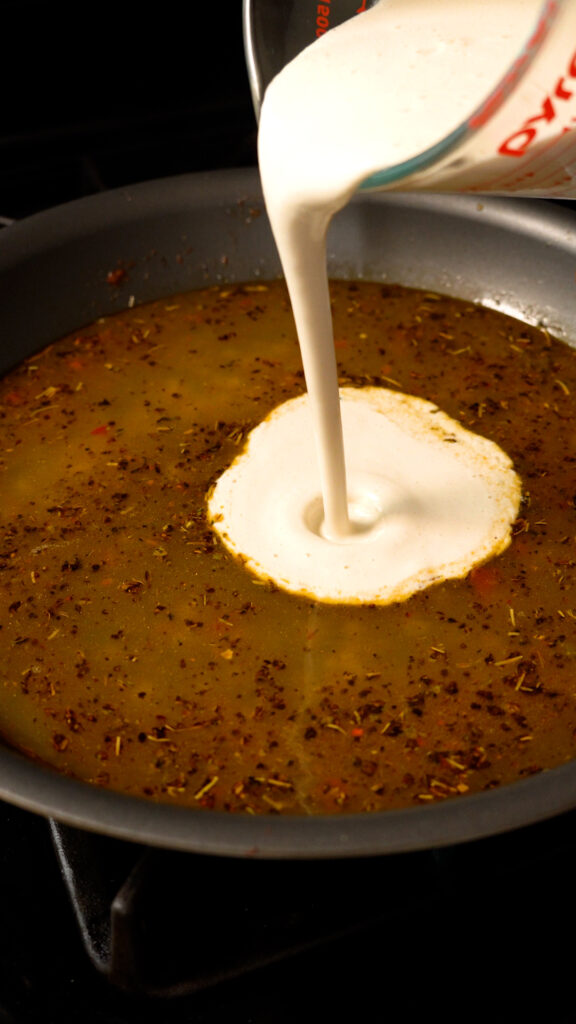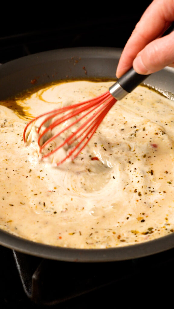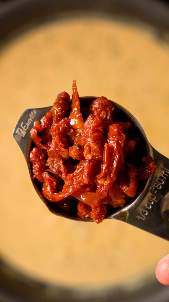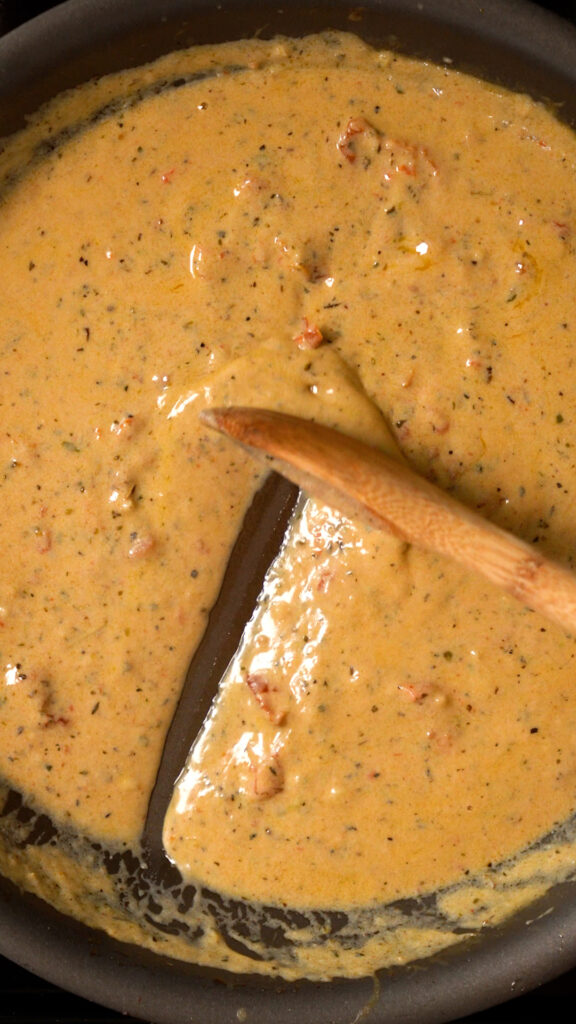 The Marry Me Sauce – For the sauce we’ll be using vegan butter, garlic, Italian seasoning, something spicy like some calabrian chiles or red pepper flakes, vegan chick’n or veggie stock, cashew cream, vegan parmesan and sun dried tomatoes.