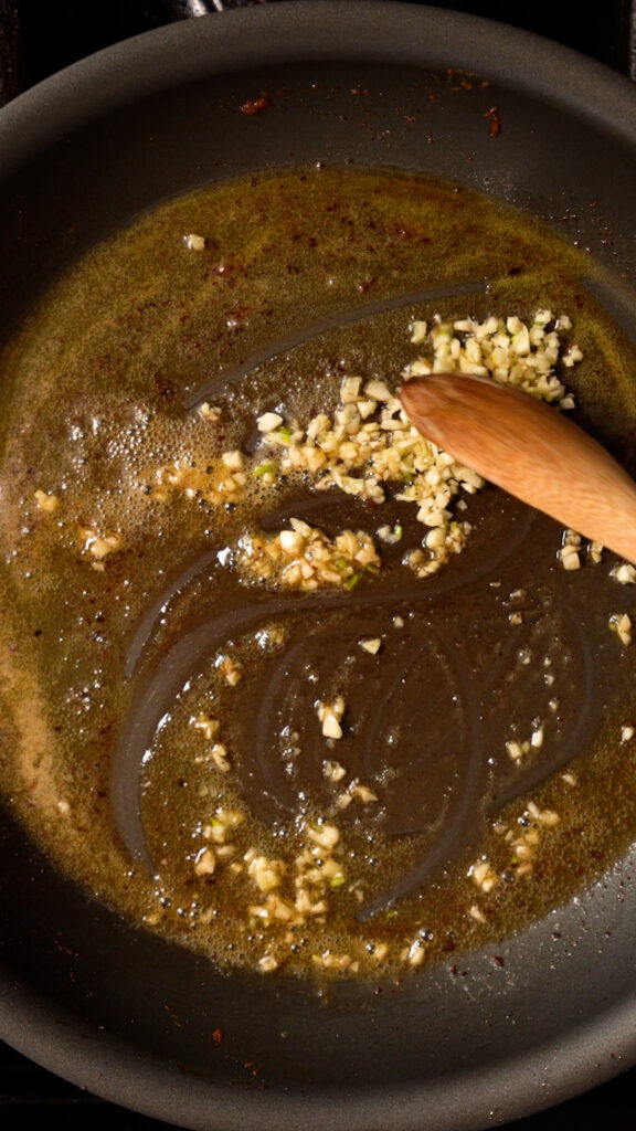 - In the same skillet that you grilled or fried the tofu, over medium low heat, add the vegan butter and melt. Then add in the minced garlic, calabrian chiles or red pepper flakes, and Italian seasoning. Stir to combine and cook for 1 minute.