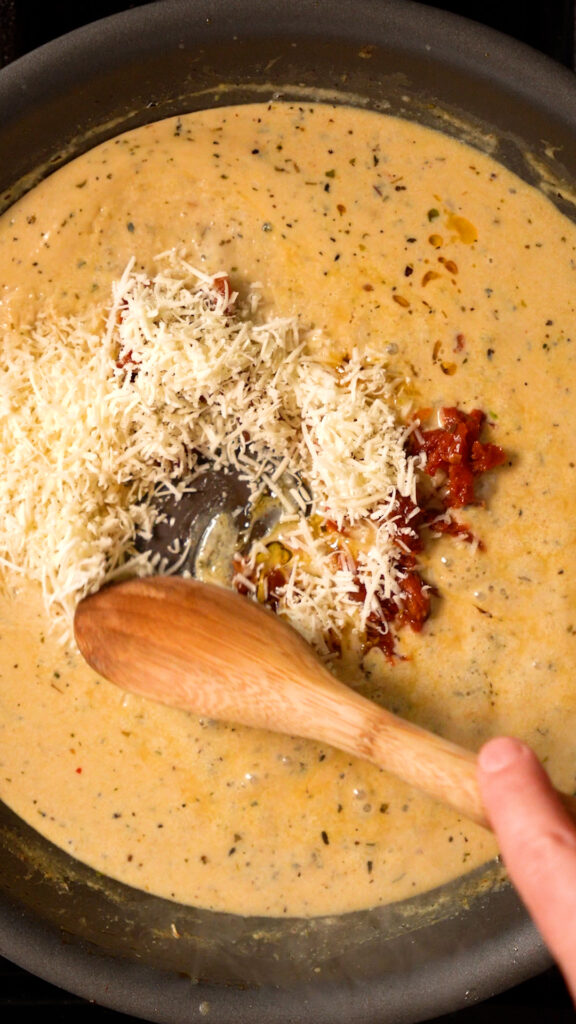 - Add in the sun-dried tomatoes and vegan parmesan (or nutritional yeast) and stir to combine.