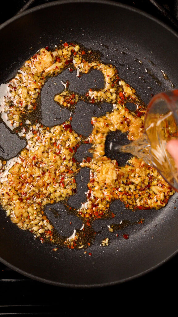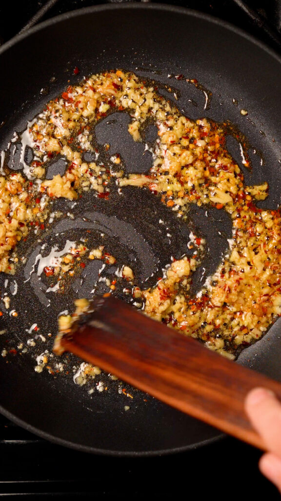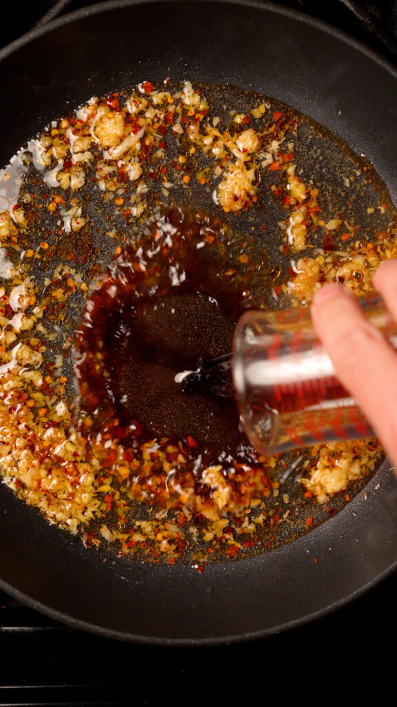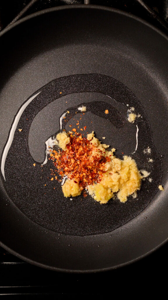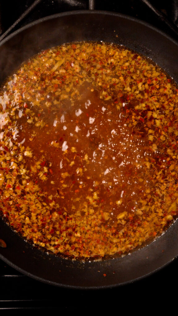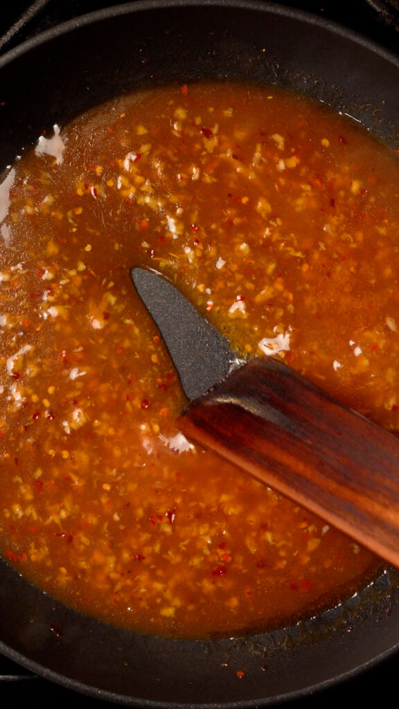 - To make the Orange Sauce, add 1 – 2 Tbsp of oil to a skillet over medium heat. Heat for a minute then add in the minced garlic and ginger along with the red pepper flakes. Stir and cook for one minute.