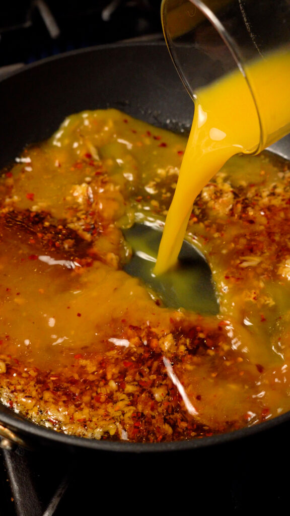 To make the Orange Sauce, add 1 – 2 Tbsp of oil to a skillet over medium heat. Heat for a minute then add in the minced garlic and ginger along with the red pepper flakes. Stir and cook for one minute.