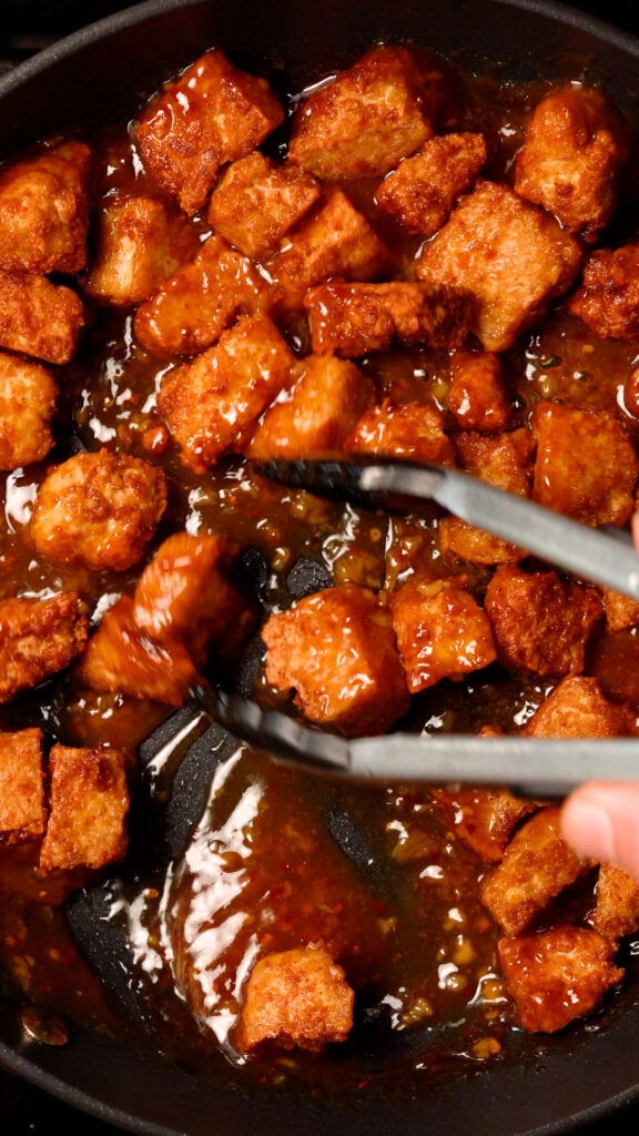 I like to prep the sauce first and keep it on low. That way I can fry the tofu and then glaze it immediately so it is as crispy as possible.