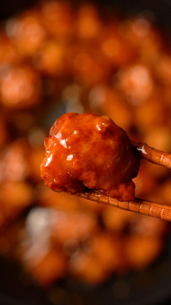 Add in the cornstarch slurry and stir to combine. Heat for a minute or so to activate the cornstarch. The sauce should thicken, if you can part it with a spatula, then it’s good! Otherwise add another cornstarch slurry a teaspoon or so at a time until it’s thickened to your desired consistency.