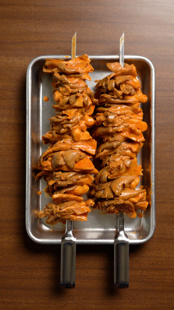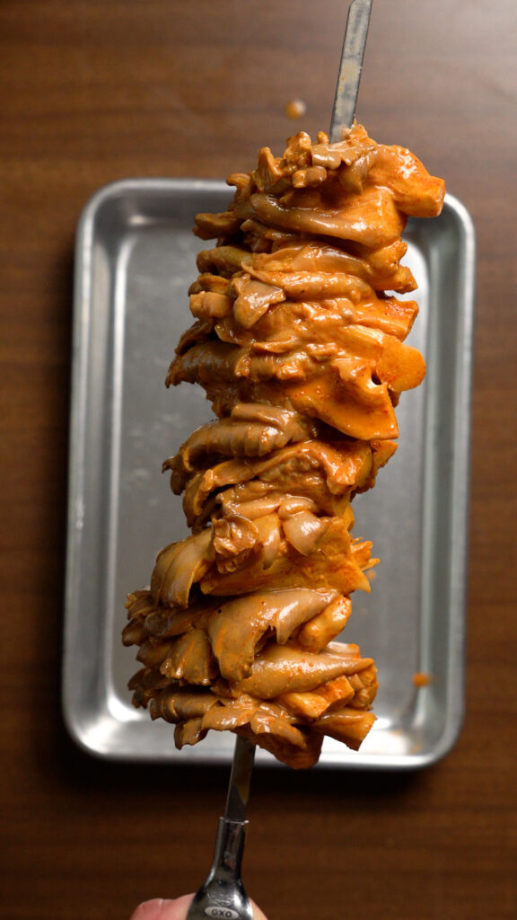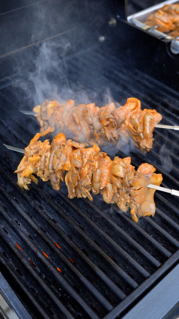 - Add the mushrooms to a Skewer and pack them relatively tight, this will help them stay in place when we flip them.