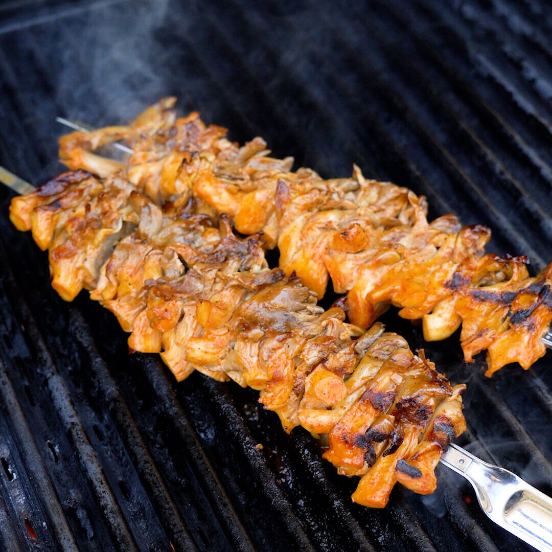 Oyster Mushrooms are Super MEATY, and perfect for the BBQ ! Eat ’em straight off the skewer or make a sandwich with ’em!