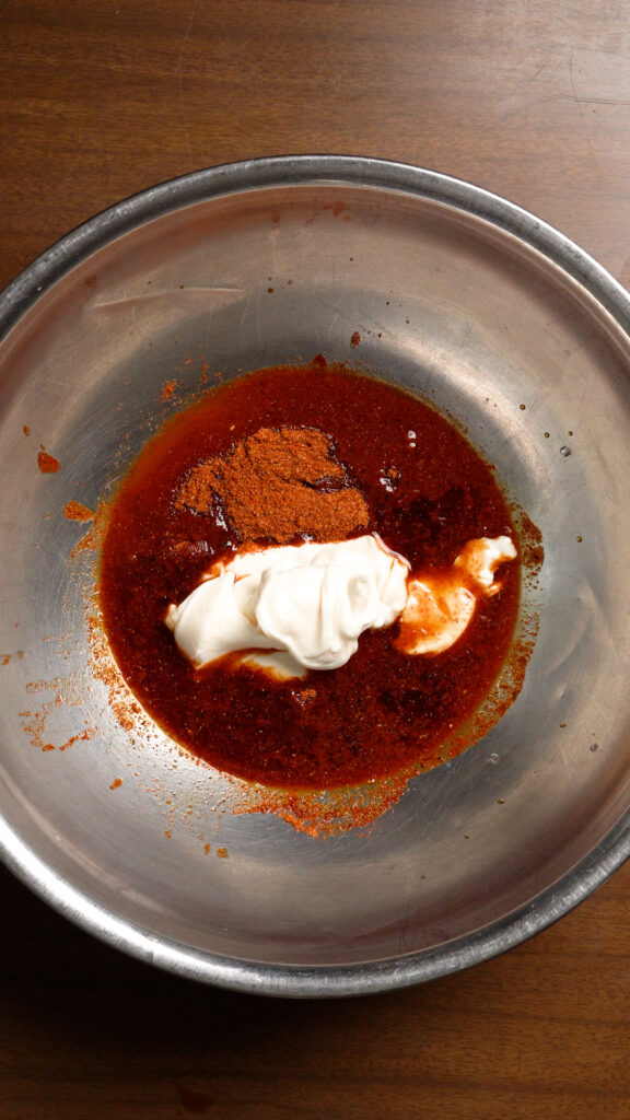 For the Marinade, it’s a simple concoction of Vegan Mayo, Soy Sauce, Water, Vinegar and Hot Sauce. I’m also using some of my homemade BBQ Rub, but you can always use a store-bought rub or seasoning blend of your choice.