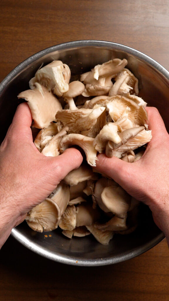 Like I said, this is quite easy. First I like to separate and cut off the longer stems on the mushrooms. I find that they can be too chewy. But you can use them in a stock or soup. You can shred or finely mince them and cook them into a pasta sauce. They are definitely edible, so don’t throw them out!