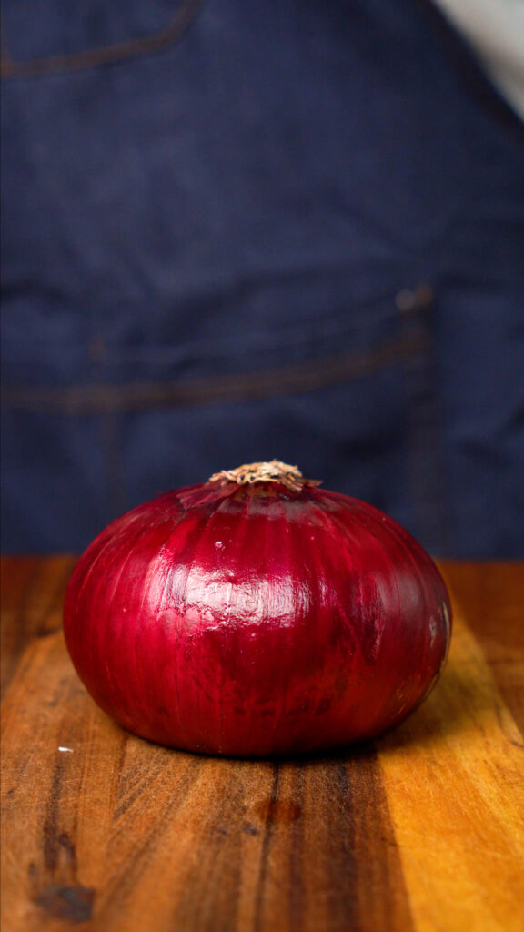 This is fairly straight forward and easy! Get a red onion, peel the outer layer, cut it in half. Then you can either slice it with a knife, or use a mandolin if you got one. Slice them nice and thin, but not too thin!