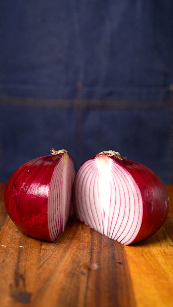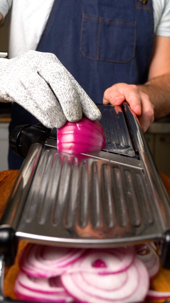 - Peel the onion and cut it in half. Use a sharp knife or mandolin slicer and cut it into thin strips. I prefer to slice mine pole to pole instead of orbitally but you do what you like!