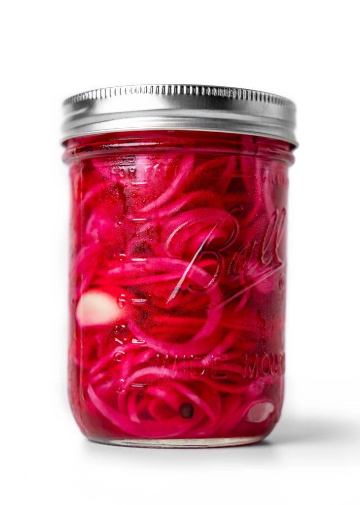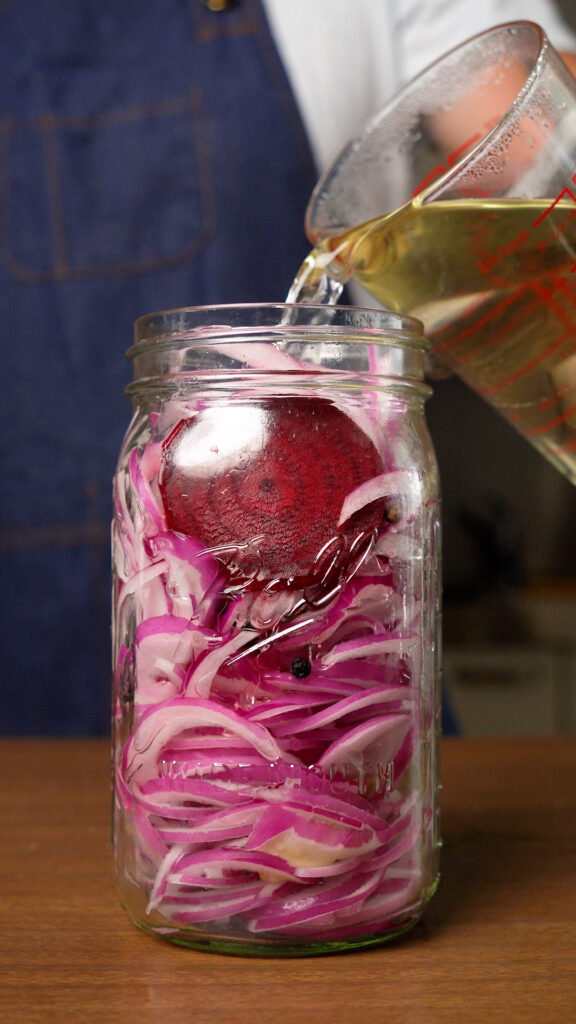 - Optionally, you can add 1 – 2 slices of raw beet to ensure the onions take on a vivid pink color. Remove the beets after an hour or so if you are worried about a beet taste coming through.