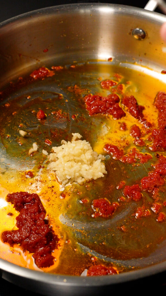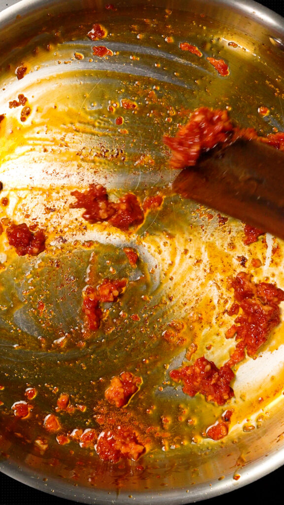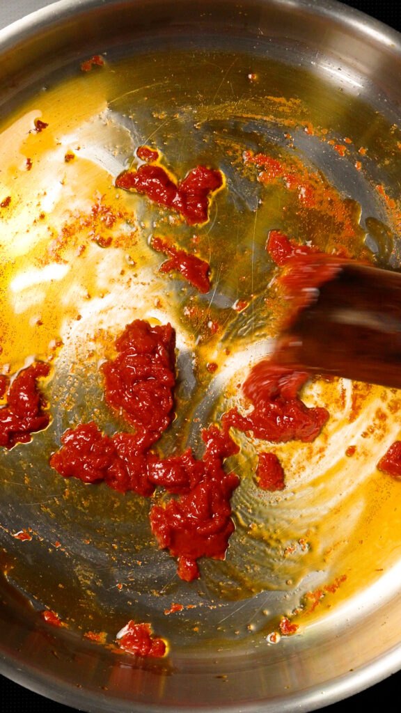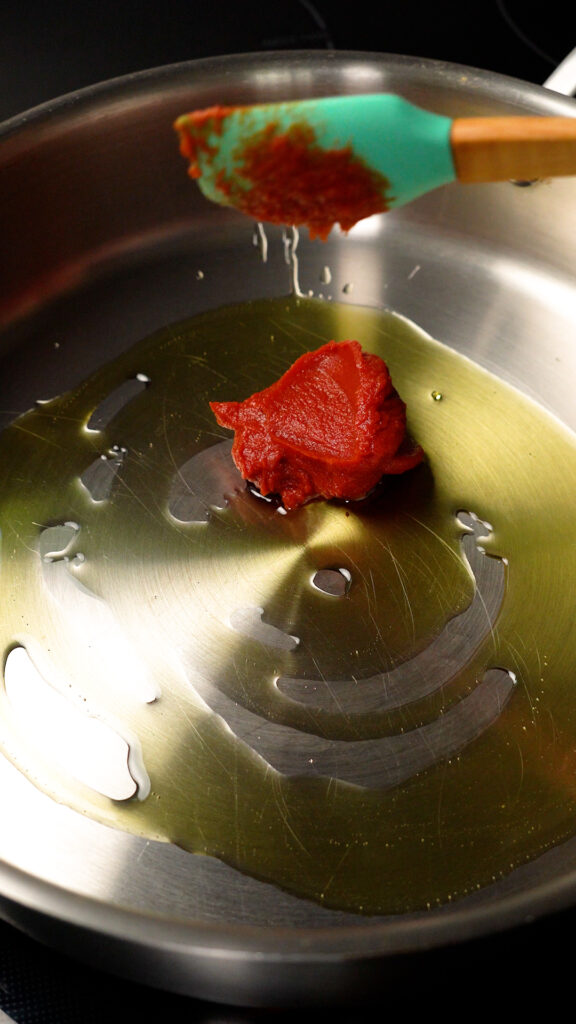 - Add the olive oil and tomato paste to a cold pan and heat up over medium heat. I recommend a cold pan as adding tomato paste to a hot pan can cause it to splatter quite a bit.