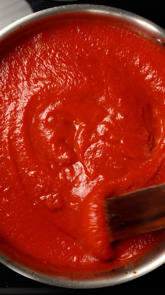 - Once tomato paste starts to sizzle stir it and cook it for about 2 minutes, then add in the minced garlic and stir to incorporate. Cook for 1 minute then add in the Passata or Crushed Tomatoes and stir together.