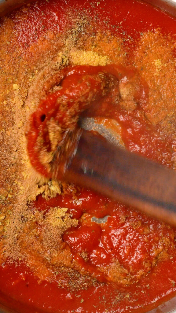 - Next add in all the seasonings. I recommend starting with the smaller measurements and adding more as you like. Calabrian Chiles are good if you want a spicier sauce, otherwise, leave them out.