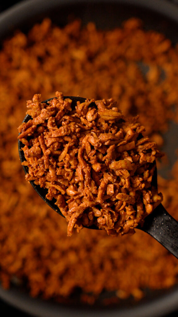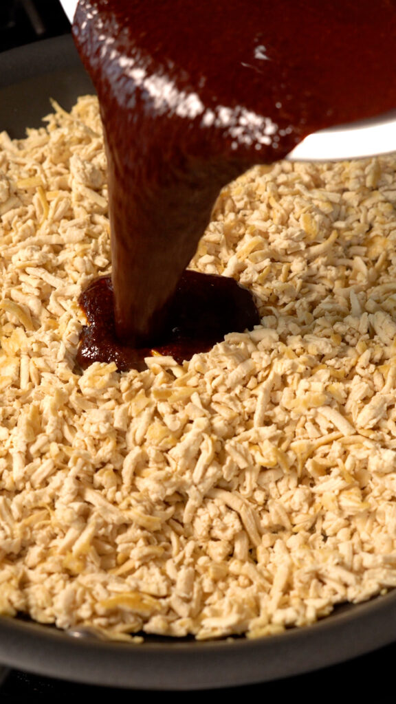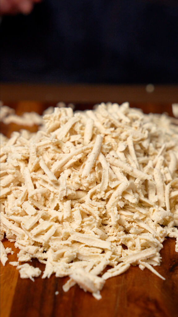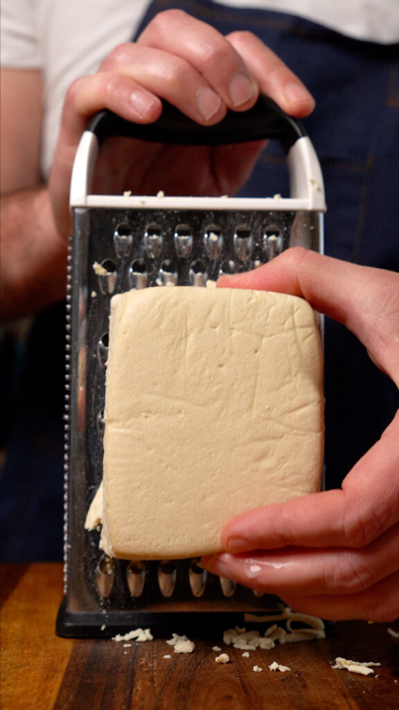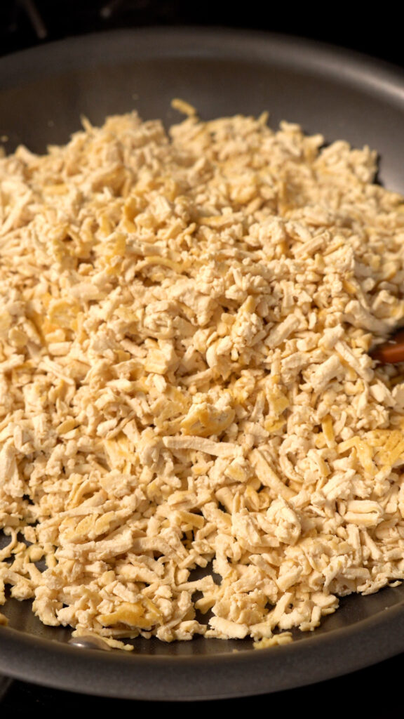 First, we’ll be shredding the tofu with a cheese grater instead of crumbling it. This does change up the texture a bit, though it is subtle. Second, we will skip the dehydrating step. I find it’s not needed for the shredded tofu, and I prefer the more tender texture of it.