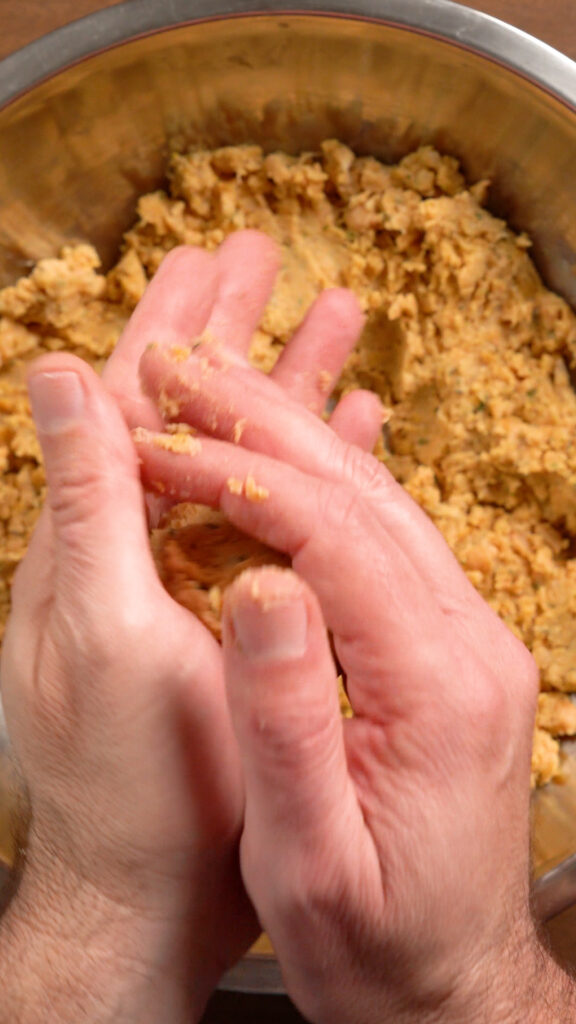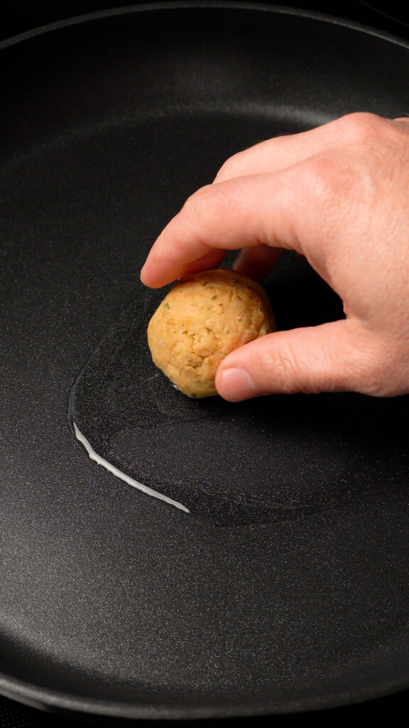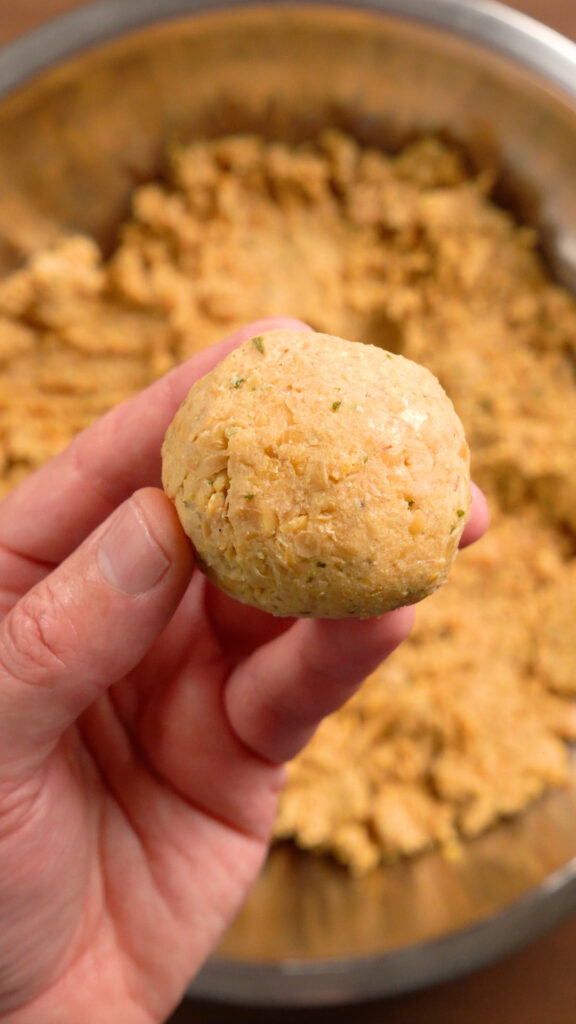 - For each Taco, grab a 2 – 3 oz portion of the Chickpea Mixture and roll into a ball.