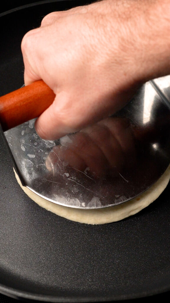 - Heat up a non-stick or well seasoned skillet over medium heat and add a little cooking oil. Once pan is hot, add the chickpea ball, and then top with a tortilla. Smash down with a burger press or stiff spatula.