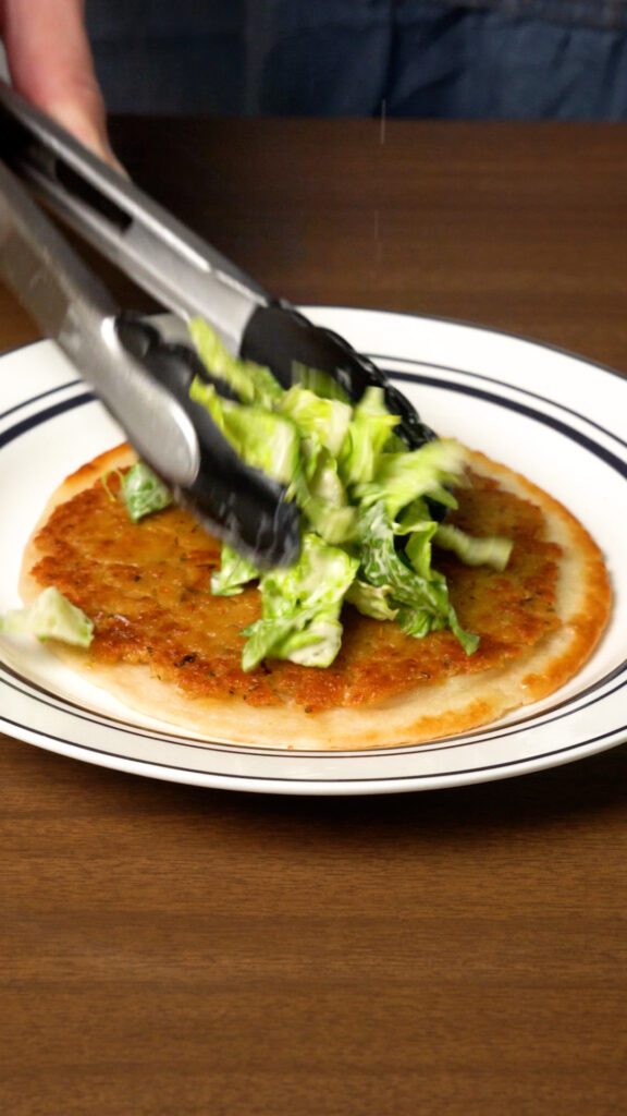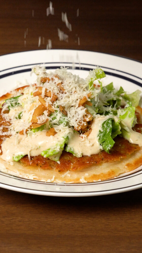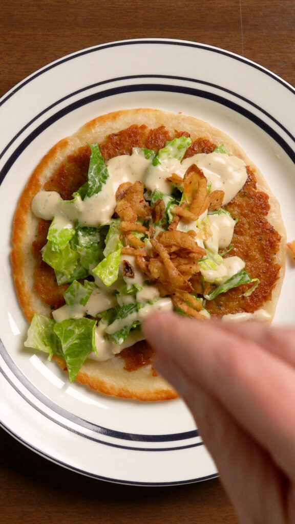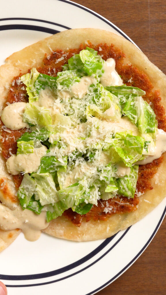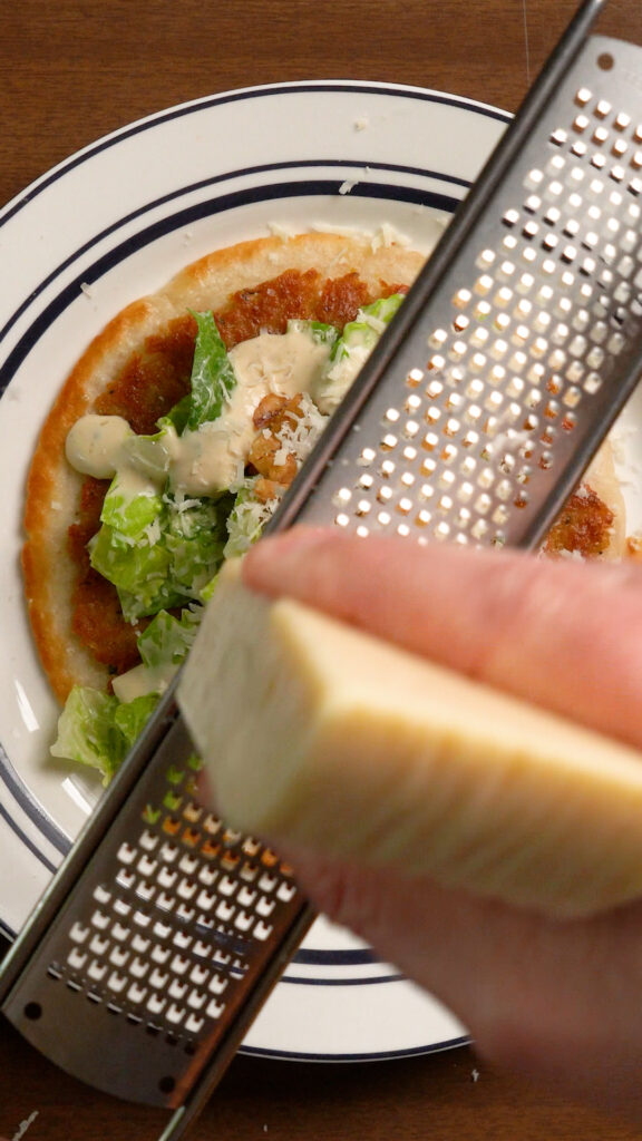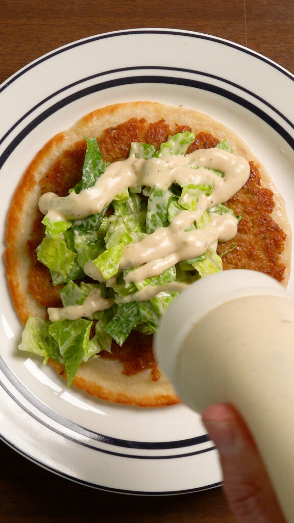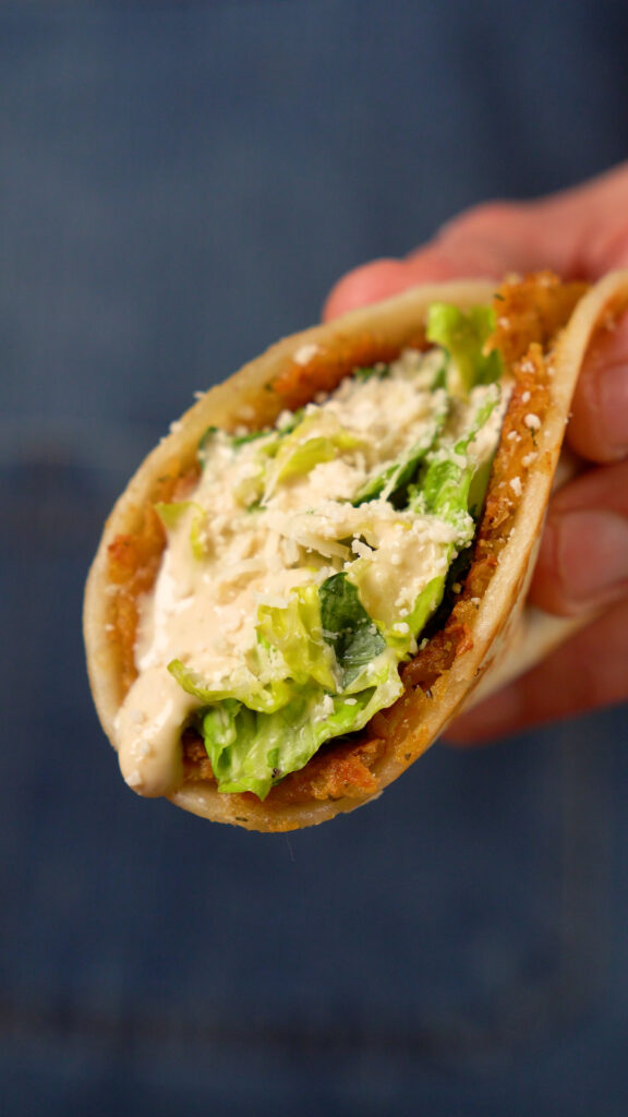 Top Taco with some of the dressed lettuce, more Caesar Dressing, Grated Vegan Parmesan, I also like adding some crispy onions, or pepperoncinis, but add whatever you like and enjoy!