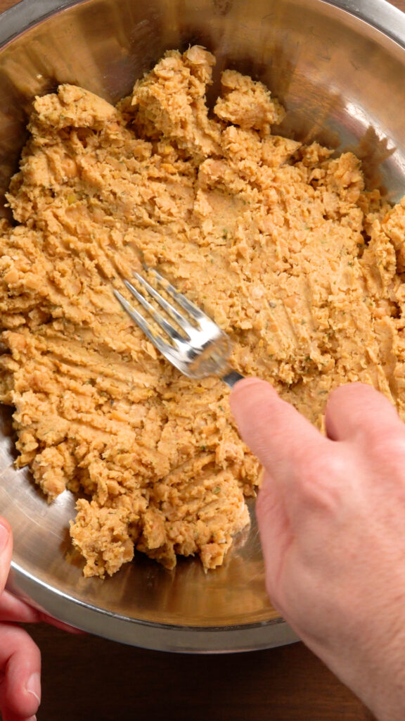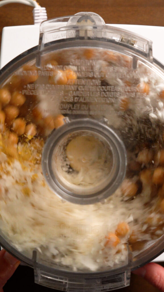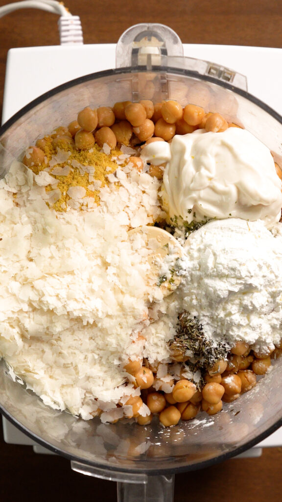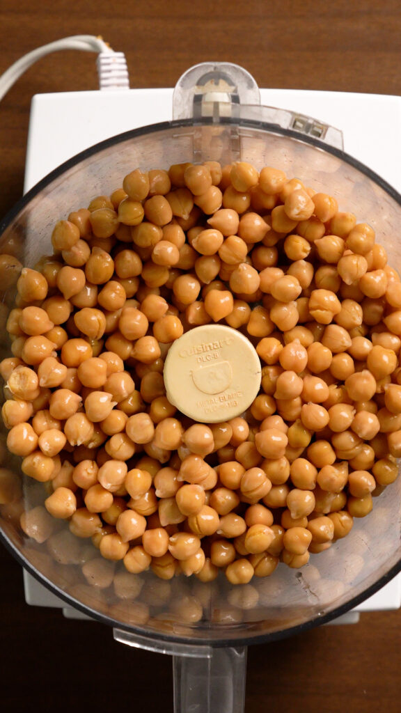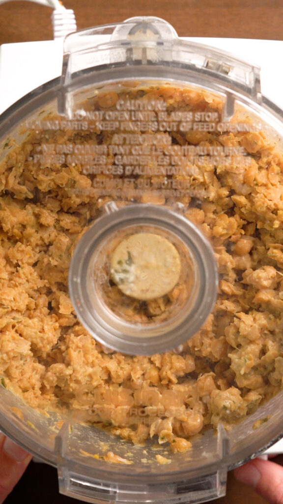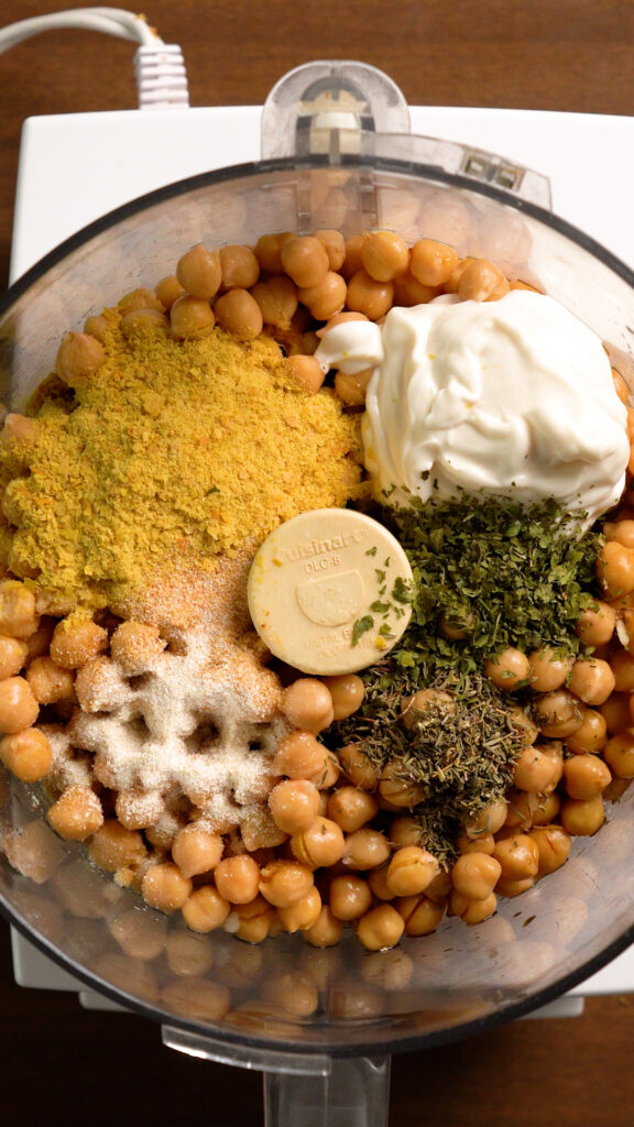 - Add the Chickpeas and the rest of the ingredients for the Chickpea Mixture to a food processor. If you don’t have a food processor you can add everything to a large mixing bowl and mash with a fork or potato masher.