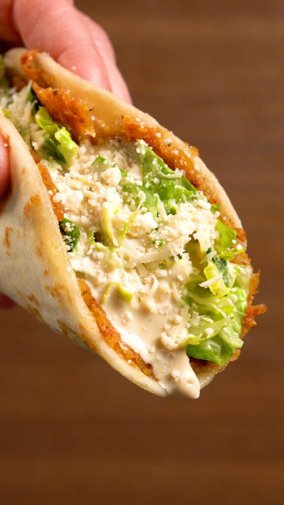- Top Taco with some of the dressed lettuce, more Caesar Dressing, Grated Vegan Parmesan, I also like adding some crispy onions, or pepperoncinis, but add whatever you like and enjoy!