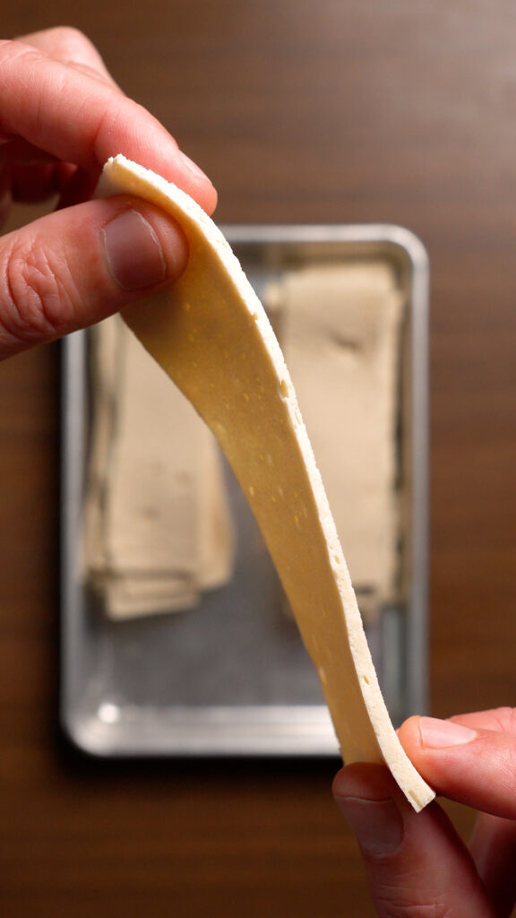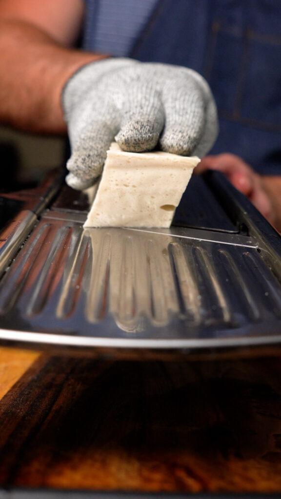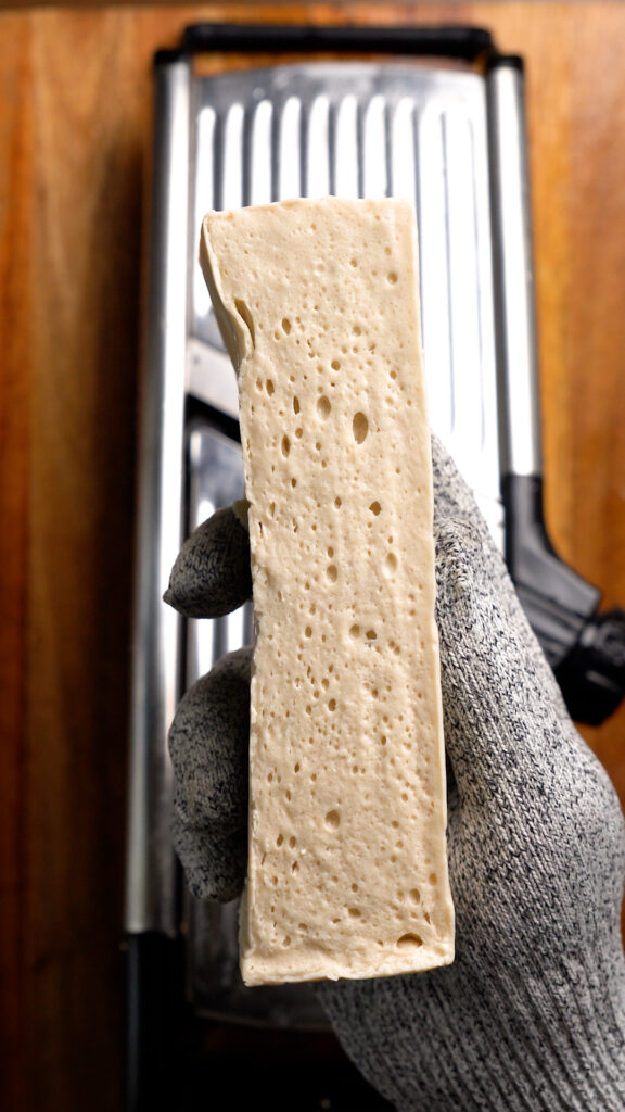 - Slice the tofu into thin strips using either a sharp knife, mandolin, or cheese slicer.