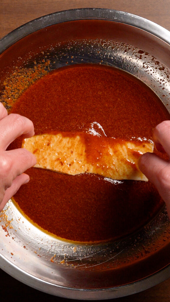 Then we’ll give each of our tofu slices a dunk in the marinade and coat thoroughly.