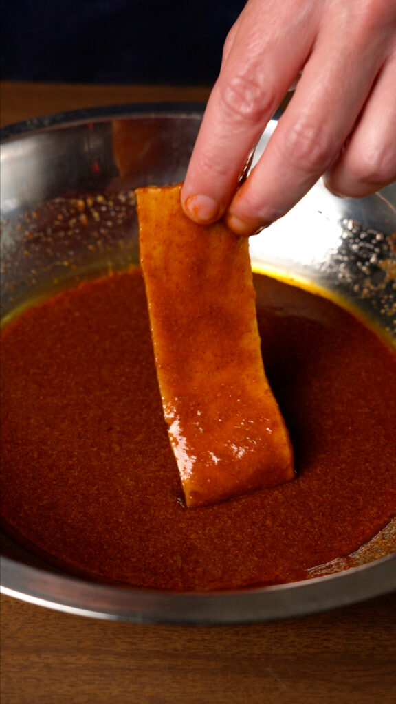 - Dip each tofu strip in the marinade and coat thoroughly. Let the excess drip off.