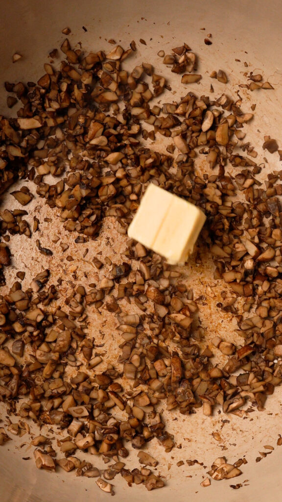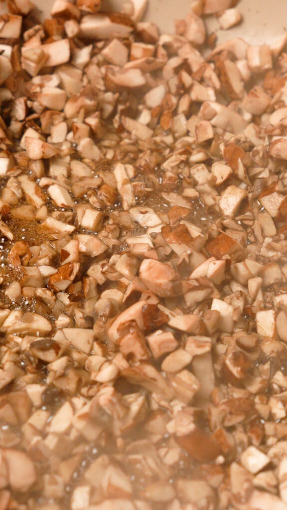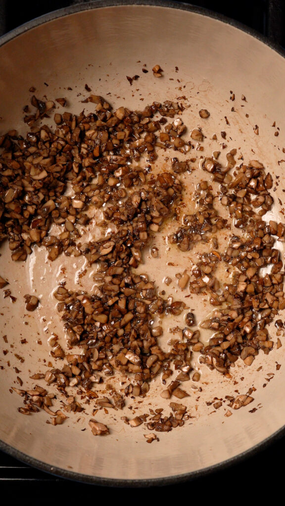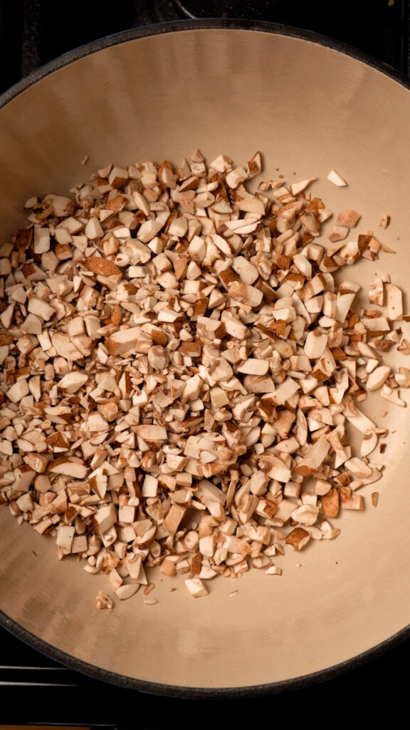 In a dutch oven or heavy bottomed pot, add the mushrooms. Turn the heat to medium and stir every now and then. Cook the mushrooms until they have released all their water. About 10 – 15 minutes.