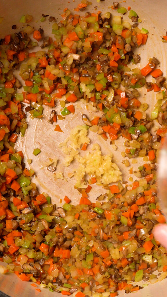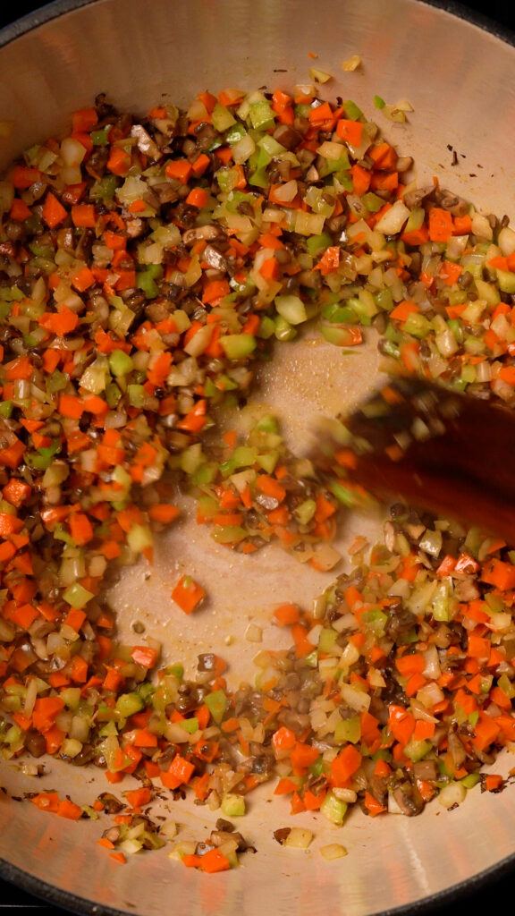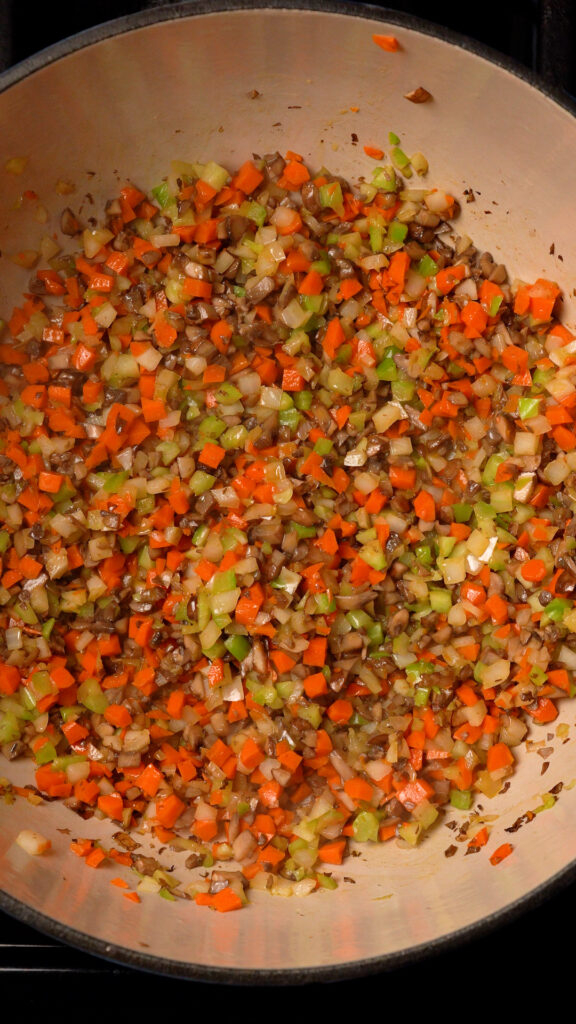Once the butter is melted, add in the onion, carrot and celery. Stir to coat and cook until the veggies have softened, about 10 – 12 minutes.